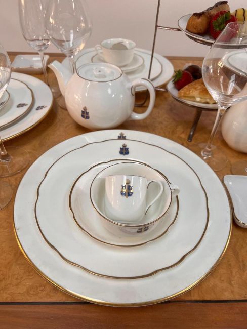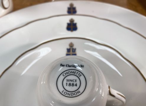 Set of Crested Crockery for Claridge's by Chommette 1884to include:4 x 31.5cm plates4 x 25cm plates4 x 18cm plates4 x tea saucers4 x coffee saucers4 x soup dishes4 x tea cups4 x espresso cups4 x espresso saucers1 x large milk jug1 x tea pot1 x butter dish1 x double handed sauce potAll crockery is unused and images are for illustration purposes and not the exact items in the lot.