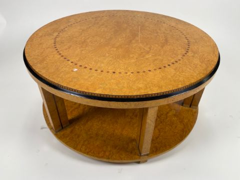 Art Deco Center TableTwo TieredInlaid WoodOn wheels for mobilitySigns of general useApproximate Dimensions: Height - 47cmWidth - 99cmDepth - 99cmLocation - I2-1