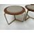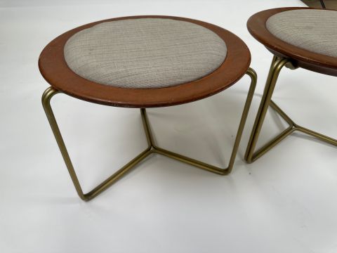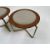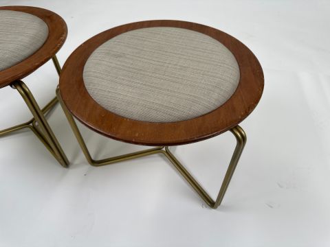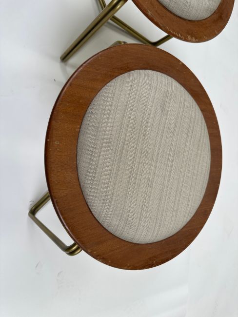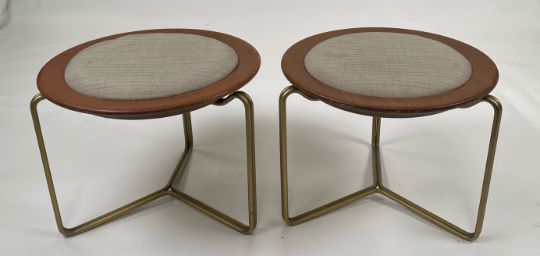 Pair of wood & fabric circular side tablesSigns of general wear as shownMetal framesApproximate Dimensions:Height - 40cmWidth - 48cmDepth - 48cmLocation - A5-2