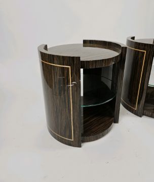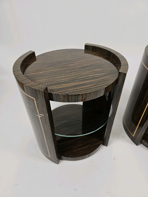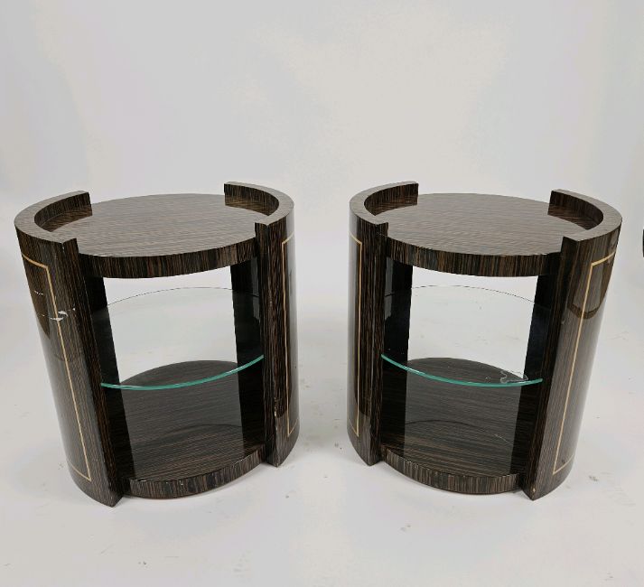 Cygal Art Deco - Art Deco Side Tables BS063 x 2Handcrafted in GermanySigns of general wear and chips on wood Glass shelf Approximate Dimensions: Height - 59cm Width -50cm Location - M1-1