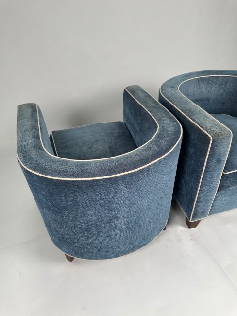 Pair of Retro Tub ArmchairsBlue fabric Signs of general use and offered in good conditionApproximate Dimensions:Height - 90cmWidth - 58cmDepth - 52cmLocation - 9-A3-1