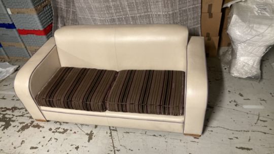 Art Deco style two seater leather sofa in mink with contrasting piping and fabric cushionsSigns of wear and tearNon fire retardant Approximate Dimensions:Length - 220cmWidth - 90cmHeight - 90cmLocation W9 GF
