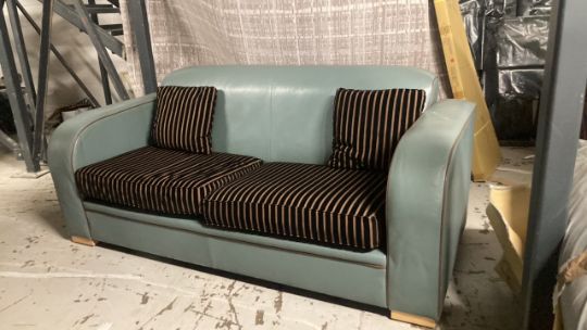 Linley two seater Art Deco leather sofa in teal with contrasting piping and contrasting fabric cushions Signs of wear and tearNon fire retardant Approximate Dimensions:Length - 210cmWidth - 95cmHeight - 100cmLocation W9 GF