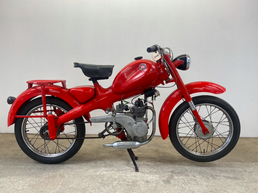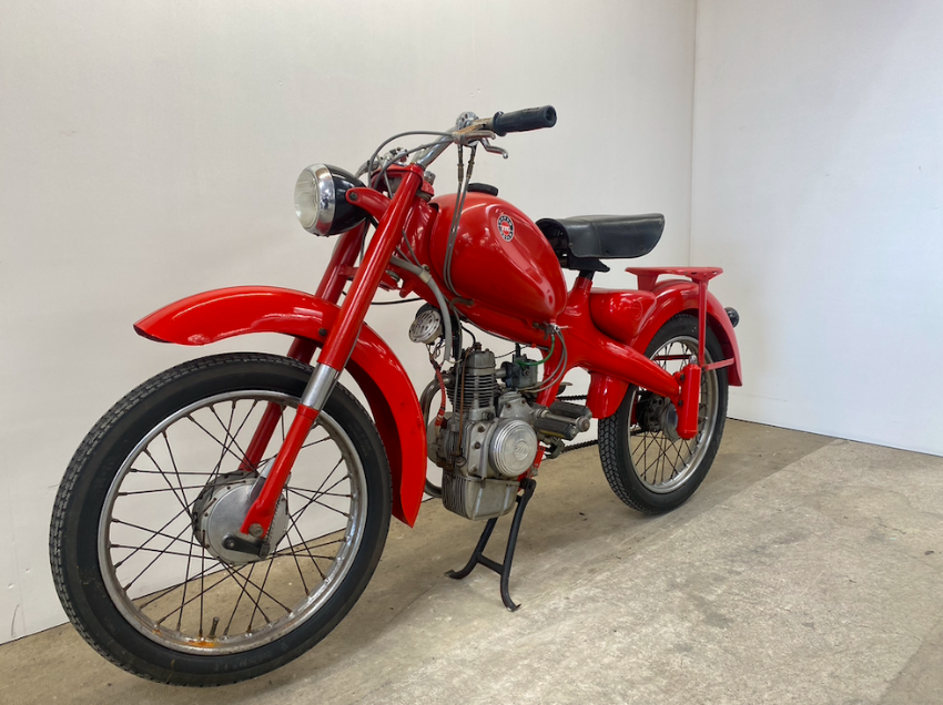 Built-in unit with a three-speed gearbox, the 48cc Motom engine had bore/stroke dimensions of 39 x 40 mm and produced 1.5h.p. @ 4,500 rpm. A rigid frame and centre spring blade type front fork were features, while later models had telescopic forks and plunger rear suspension. On early models, the fuel tank was incorporated into the frame while on some later ones it was a separate component.