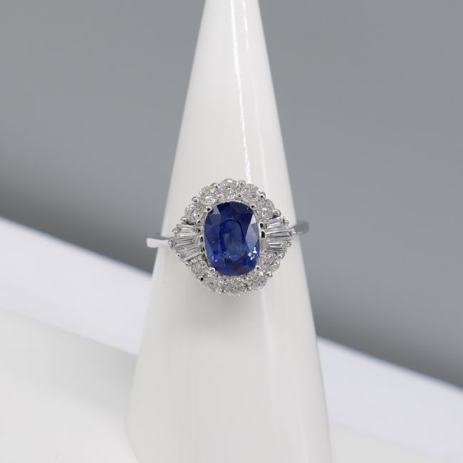 Sapphire: natural; oval-cut; 1.74 cts; blue / lightly included; claw-set.