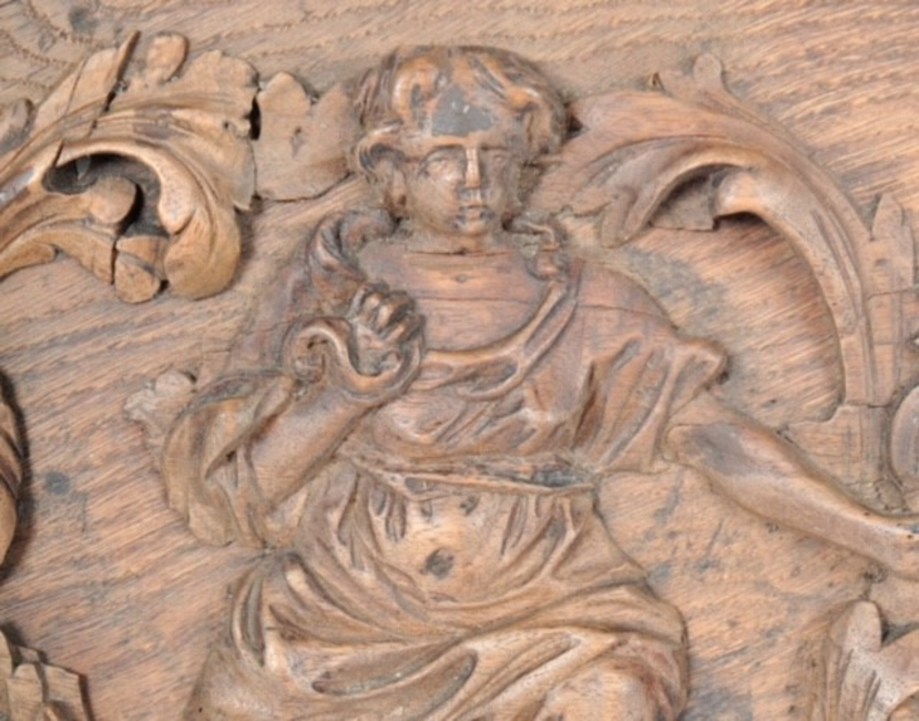 Scroll and foliate decoration throughout with carved figures, birds and masks with a central cherub below a protruding Jesus, holding the orb with detailed carved leaf decoration surrounding him. Wear commensurate with age, overall a good example.