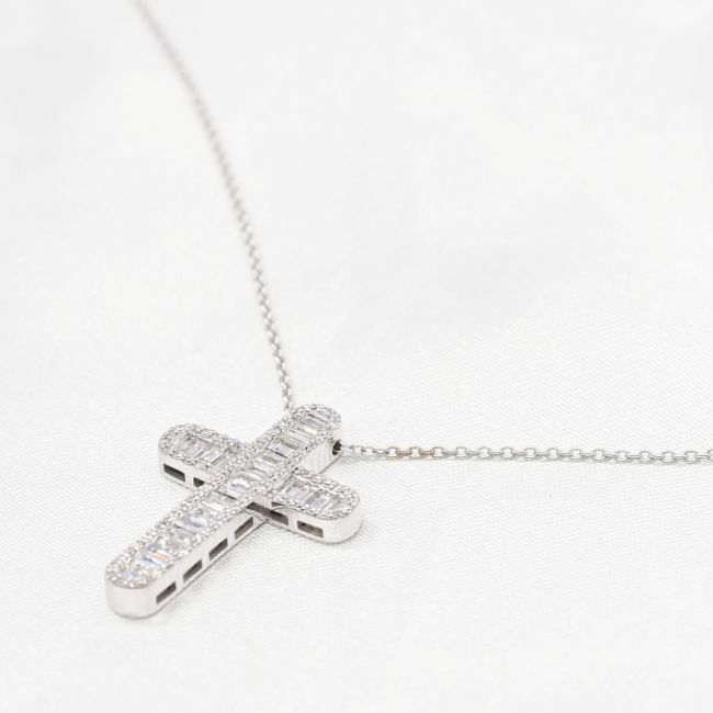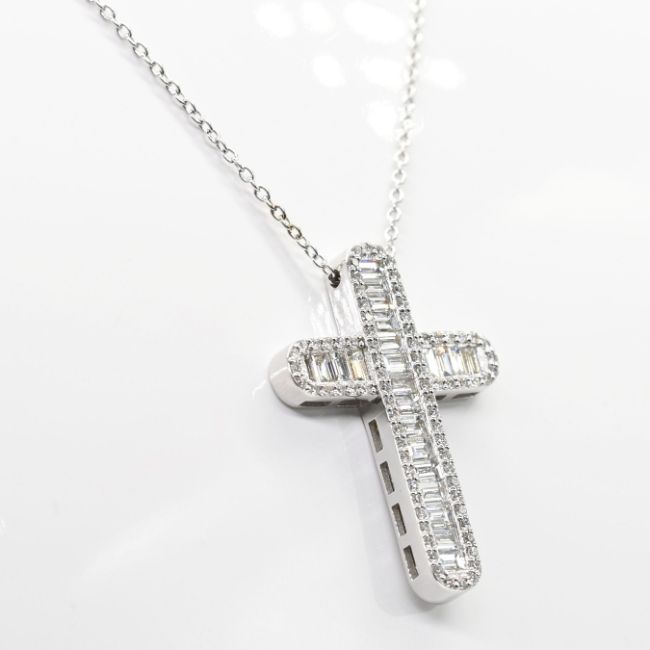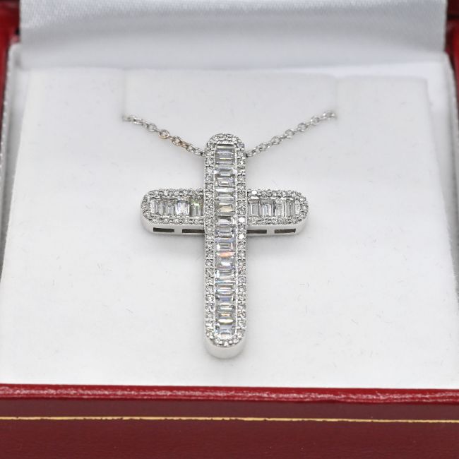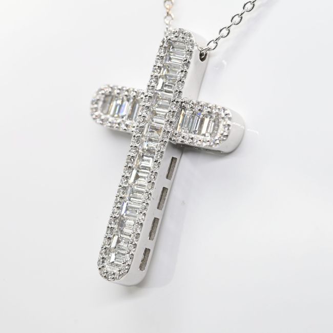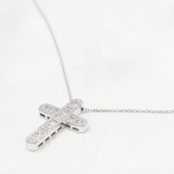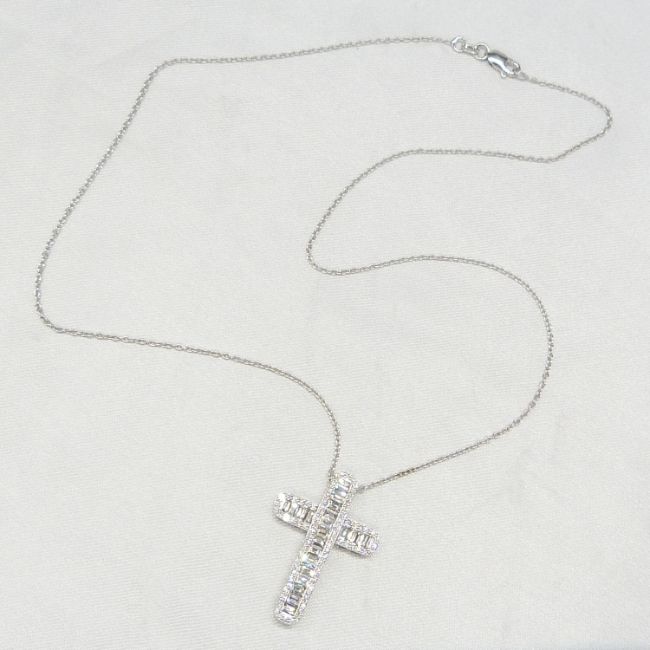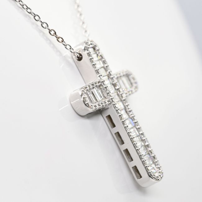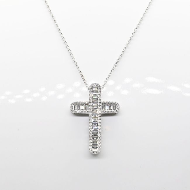 Diamonds: natural; several baguette and round brilliant-cut; 2,00ct total; H-I, good SI-I approx. Cross measurements: 29 x 20mm. Chain: 42cm; lobster claw clasp.