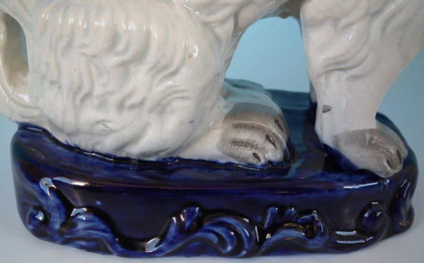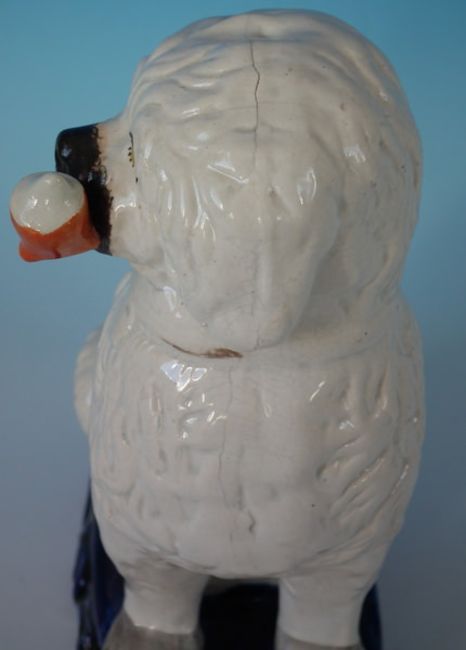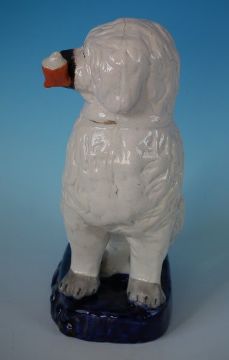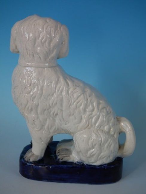 Staffordshire Pottery figure of a spaniel smoking a pipe, seated on a cobalt blue base. PERIOD: Victorian, circa 1860. DIMENSIONS: 8.7ins high, 6.7ins wide, 3.9ins depth. CONDITION REPORT:Good. Small flake to tail. Some rubbing to gilt. Feint shrinkage line along the mold join of dog's back and head; thin glaze to cobalt base. Remodelled pipe. Retouched paint losses to face.