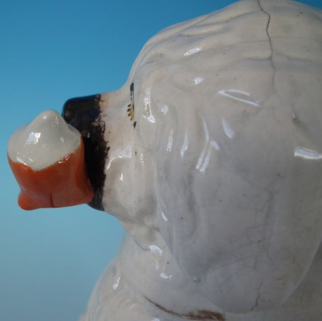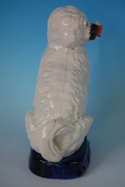 Staffordshire Pottery figure of a spaniel smoking a pipe, seated on a cobalt blue base.