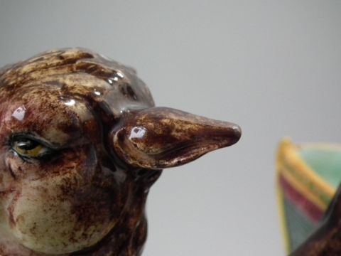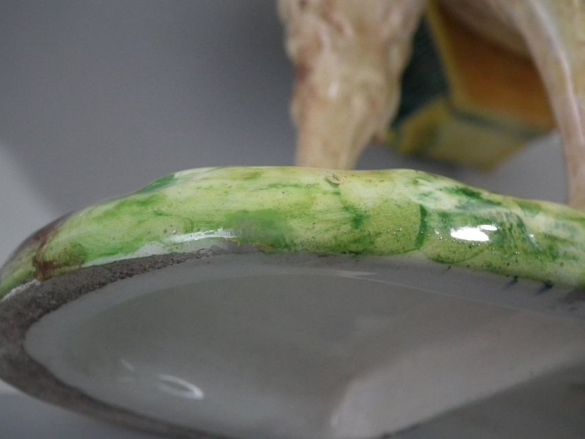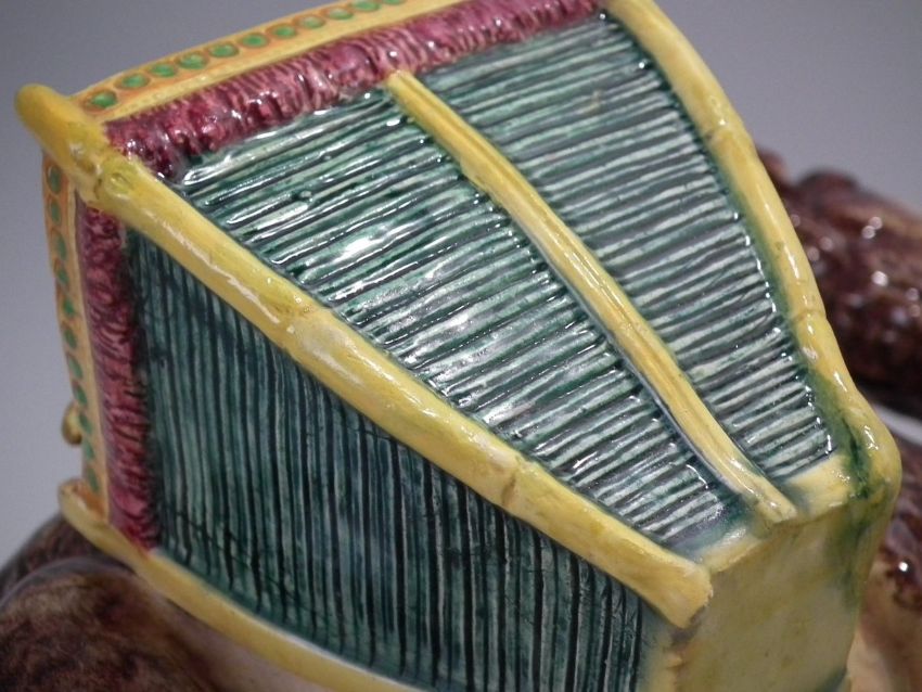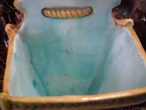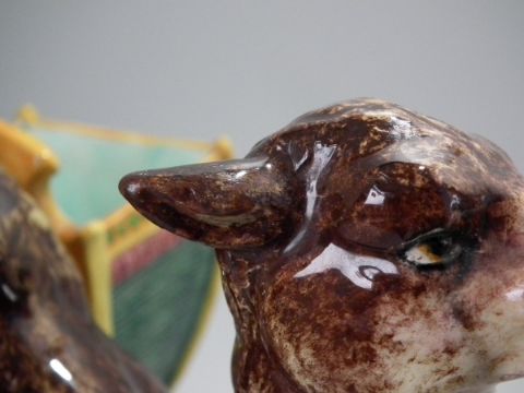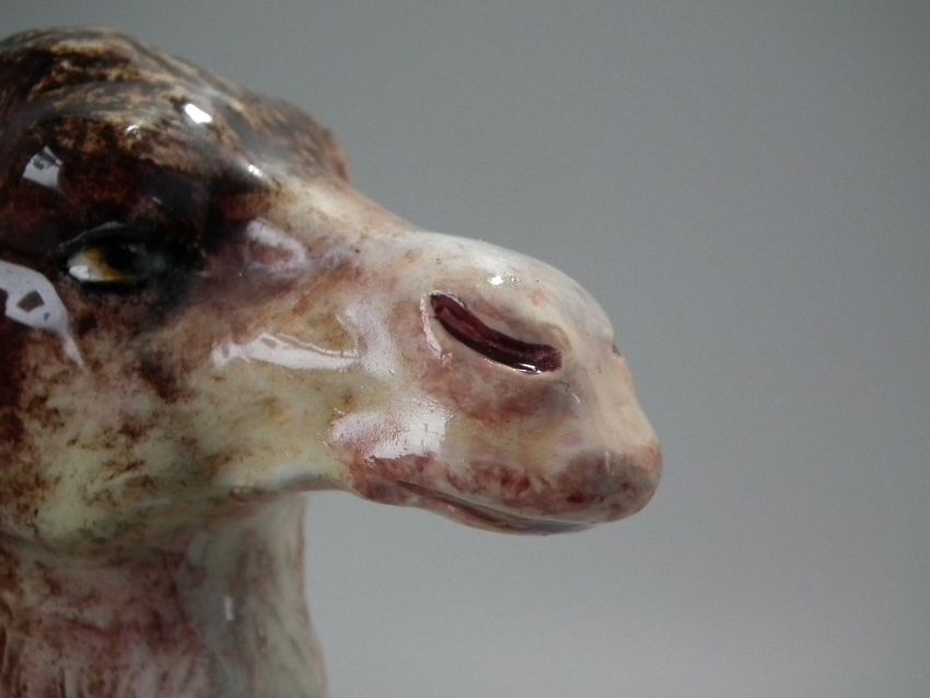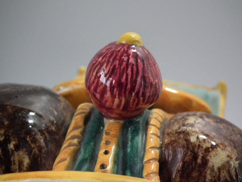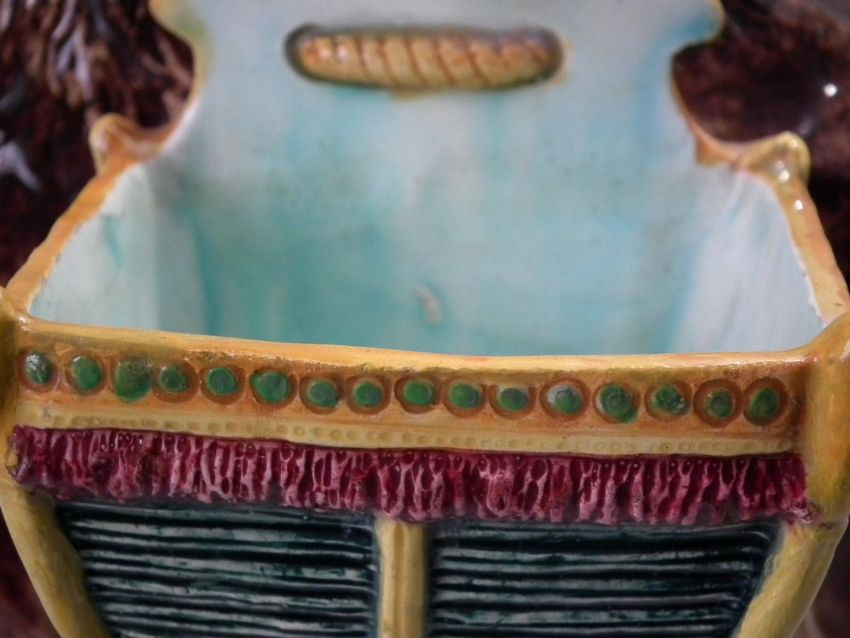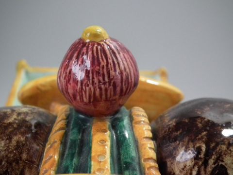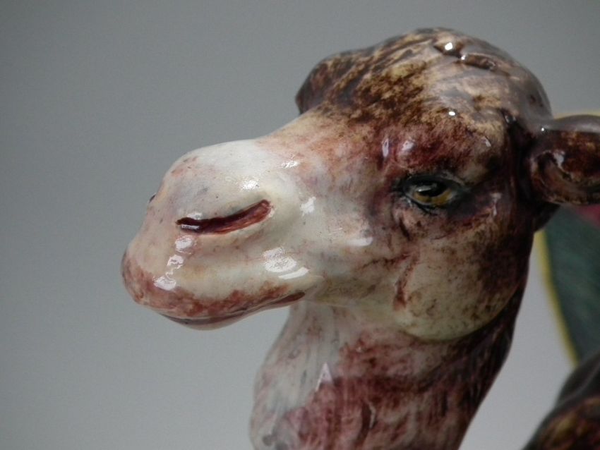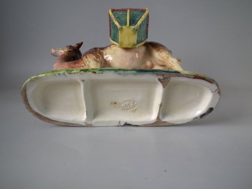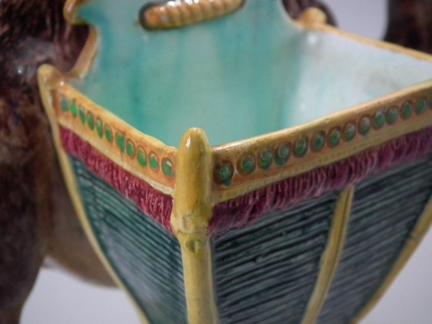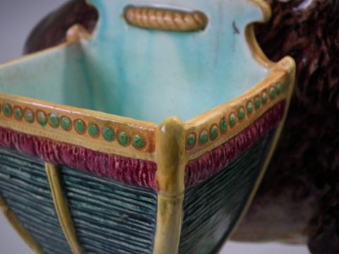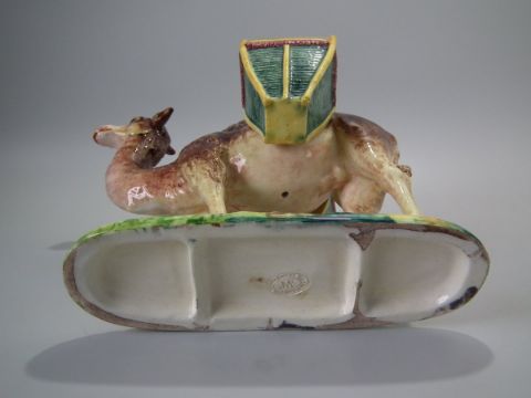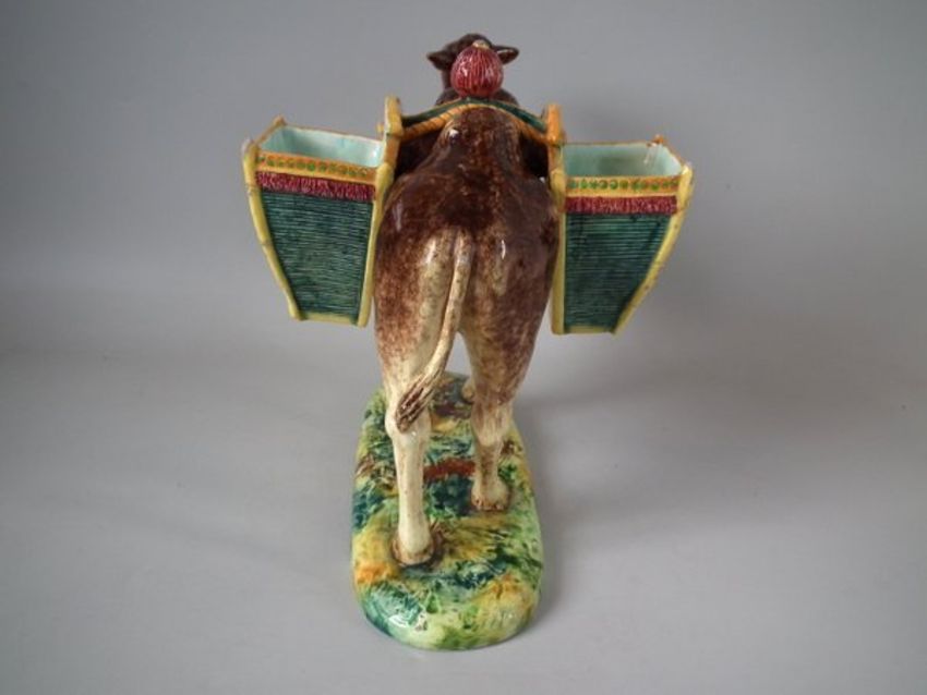 Jerome Massier Majolica barbotine figural which features a camel with pannier baskets either side. The piece bears maker's marks for the Jerome Massier pottery. PERIOD: Victorian, circa 1900. DIMENSIONS: 9.8ins high, 12.6ins wide, 7.9ins depth. CONDITION REPORT:Good. Restored hairline to rim of one basket. Retouched flakes to rims of both baskets, central knop of saddle, base rim, camel's ears, face and tail. Filled chip to edge of basket.