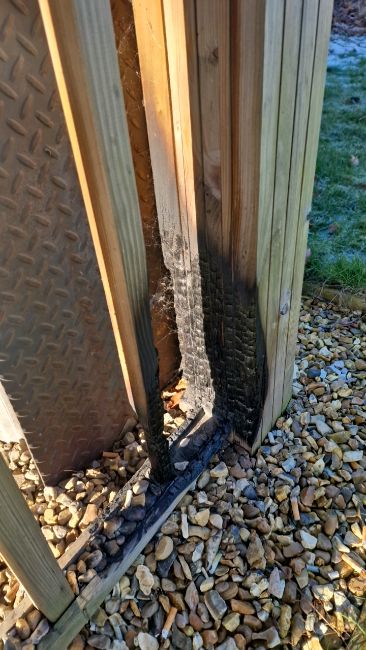 Some fire damage can be seen in one of the corners