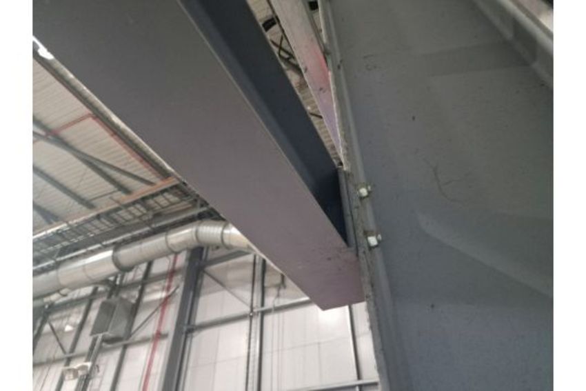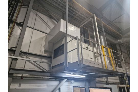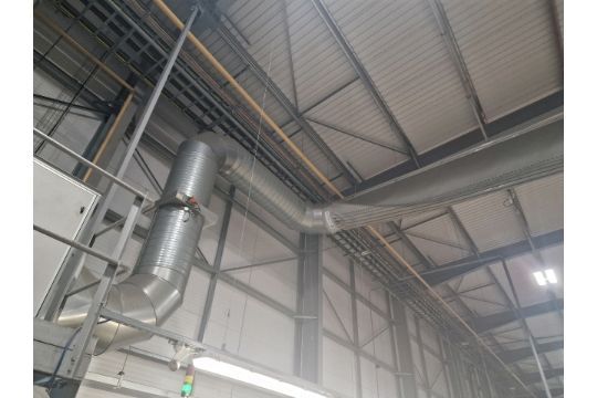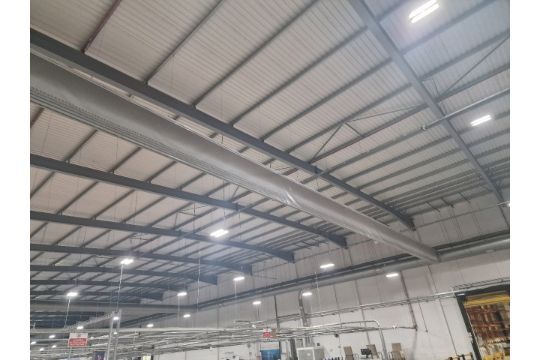 This lot includes: 1 industrial heating unit, the piping, the sock and the gantry it is fitted to. The gantry is secured by bolts to the warehouse structure.