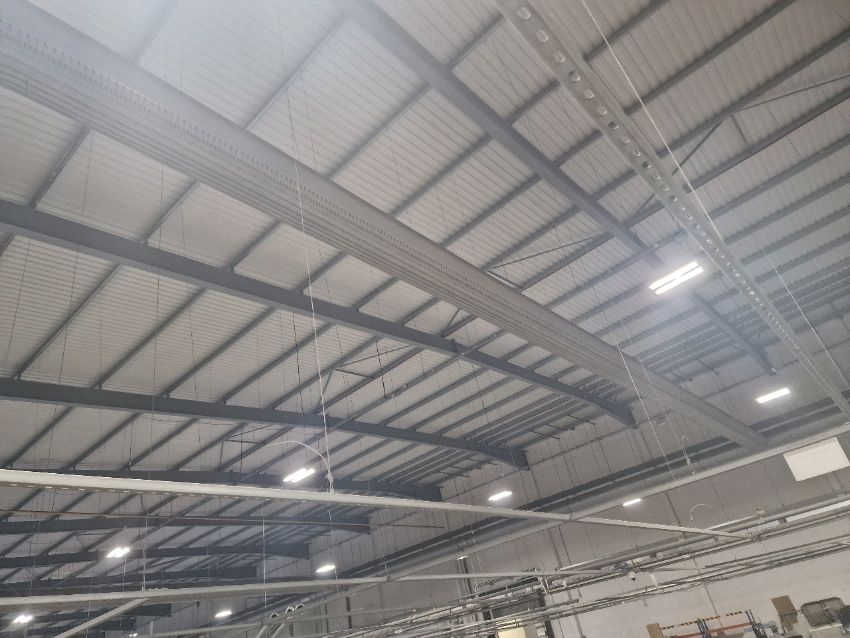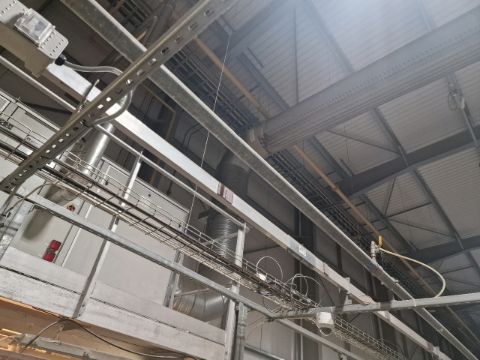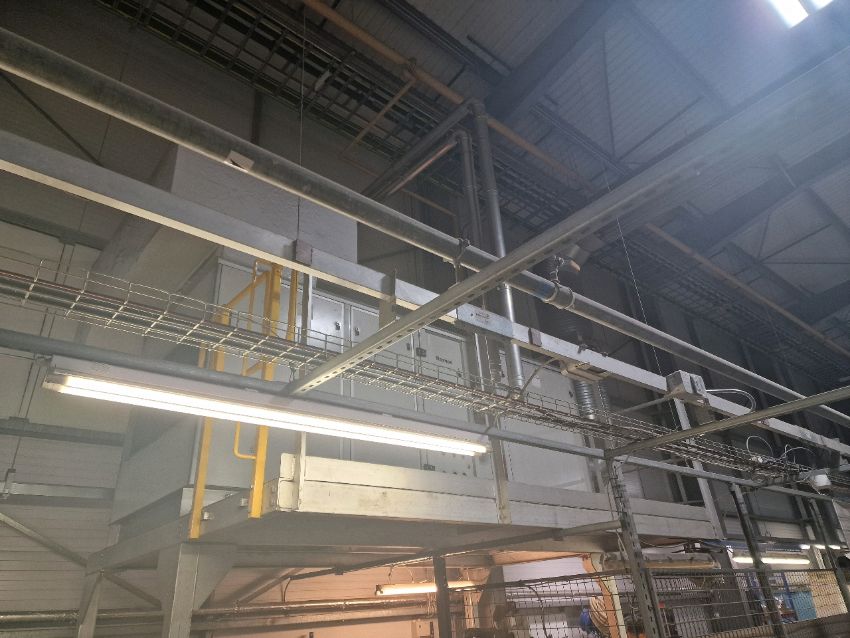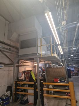 This lot includes 1 industrial heating unit, the piping, the sock and the gantry it is fitted to. The gantry is secured by bolts to the warehouse structure.