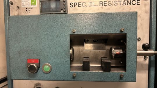 Machine for testing the electrical conductivity of core samples from carbo cathodes and other dense formed materials