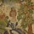 A cottage on a hill in the background. A dog, flowers and foliage in the foreground. The gent is playing a horn and is holding a shepherds crook. One tree is full of fruit. The other is similar, except the lady and gent have switched sides and the gent plays a lute. The lute has metallic strings.