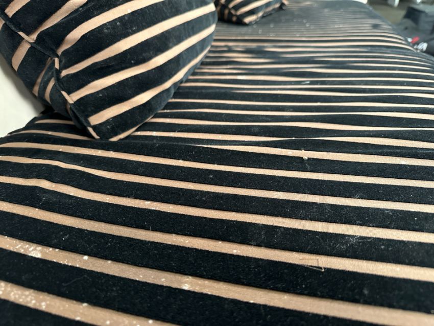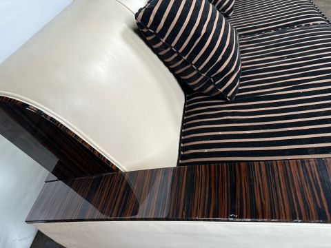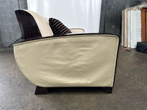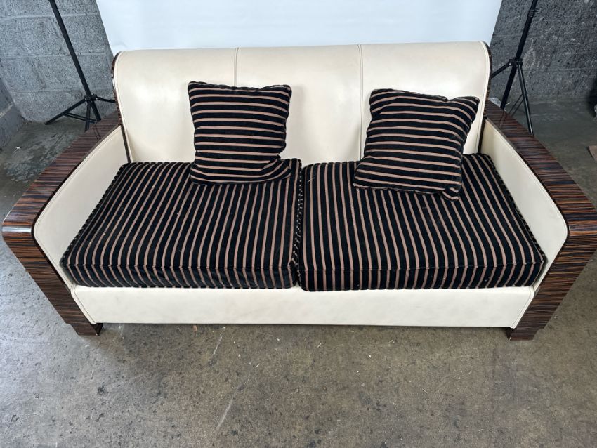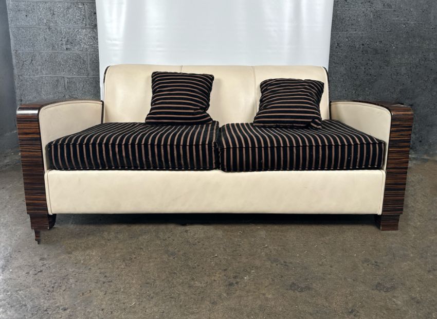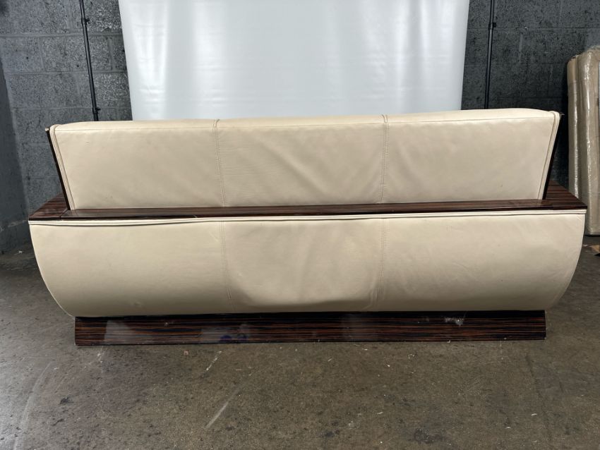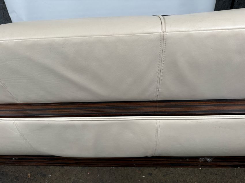 David Linley Cream Leather Back Sofa Leather arms and back with fabric cushions Approximate Dimensions: Height - 75 Width - 177cm Depth - 95cm Signs of wear Location - Unit 12 Ref 52