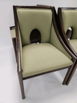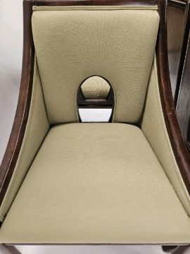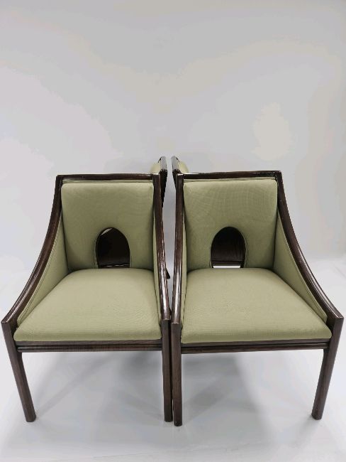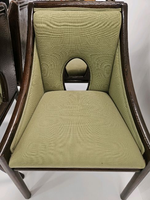 Pair of Mid-Century Walnut Dining Chairs Green fabric Signs of general use Approximate Dimensions: Height - 90cm Width - 58cm Depth - 52cm Ref 162 Location - Unit 9