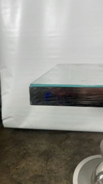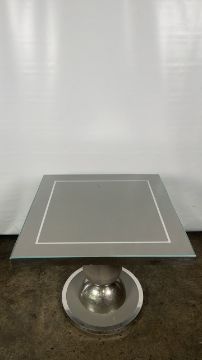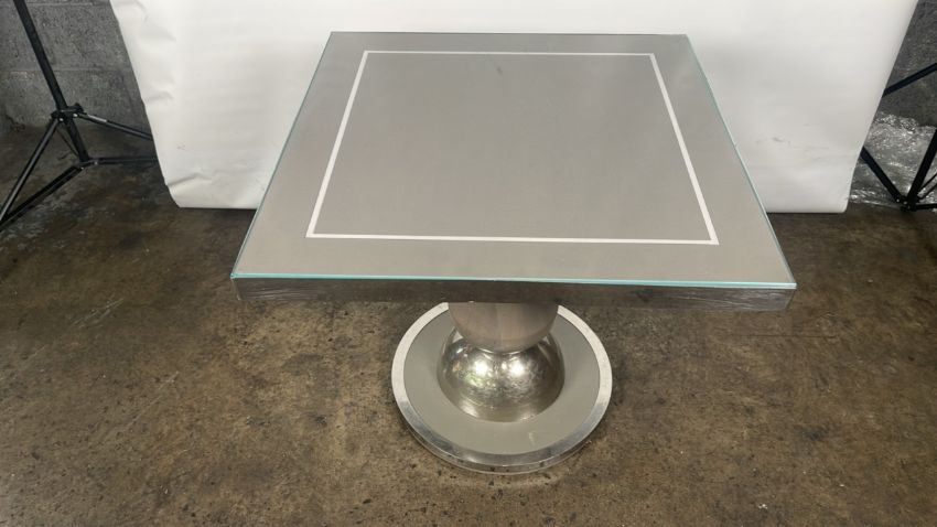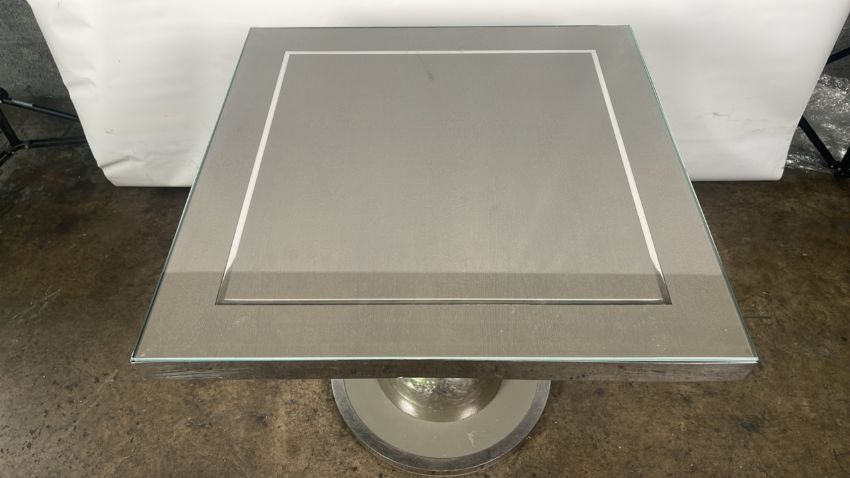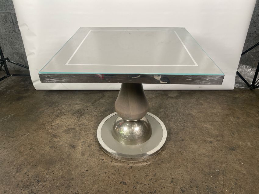 Oak table with nickel detailing and glass top