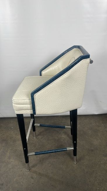 Ostrich Leather Bar Stool Designed for The Berkeley Blue Bar designed by Robert Angell and hand made by custom furniture craftsmen Ben Whistler Signs of use Black wood and chrome frame Approximate Dimensions: Height - 110cm Width - 55cm Depth - 60cm Ref 290 Location - Unit 11