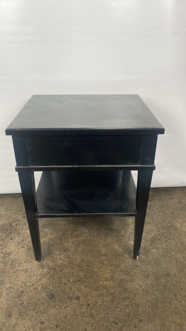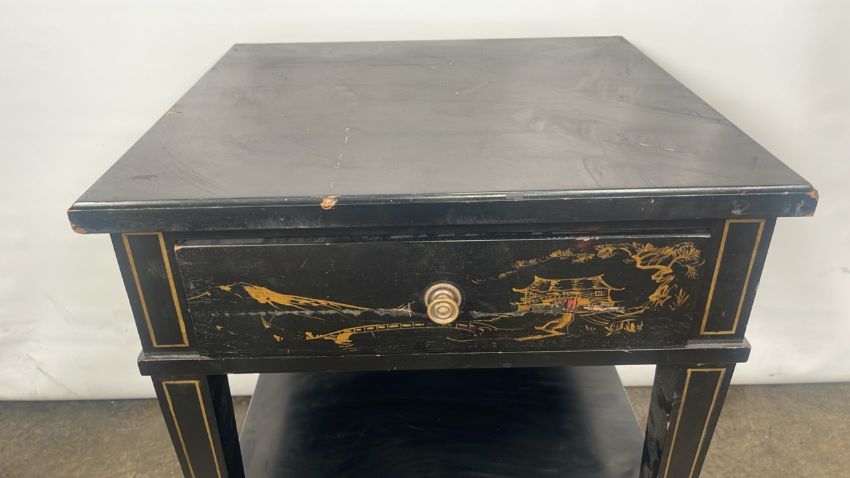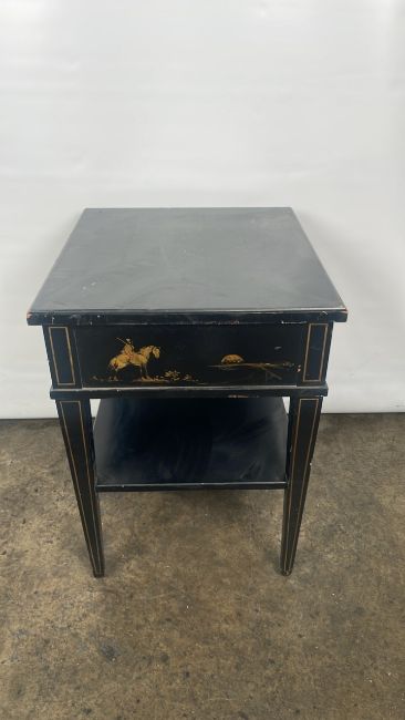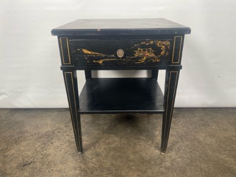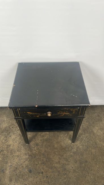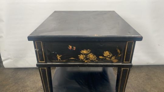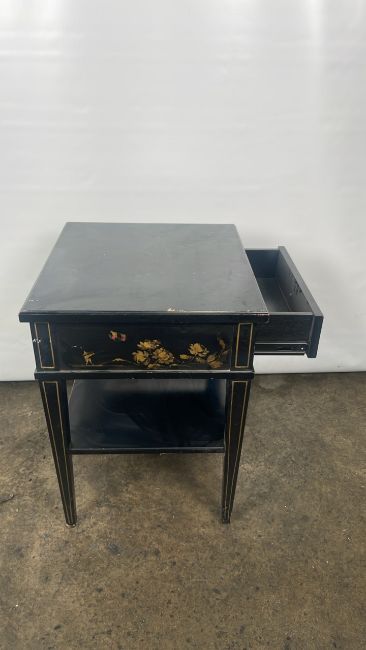 Trouvailles Hand Crafted Oriental Side Table with Drawer Black wood with paint detailing Signs of use Approximate Dimensions: Height - 66cm Width - 55cm Depth - 50cm Ref - 41 Location - Unit 11