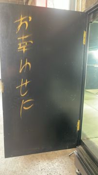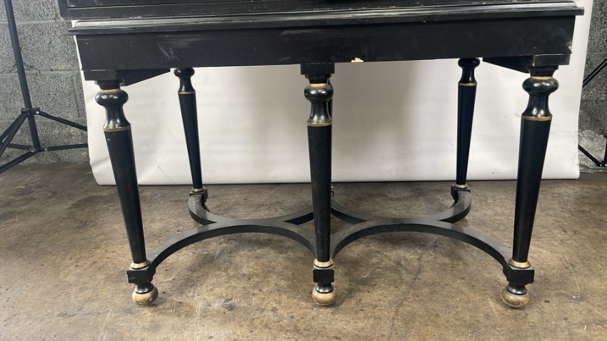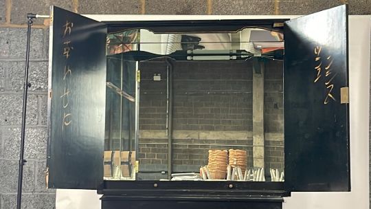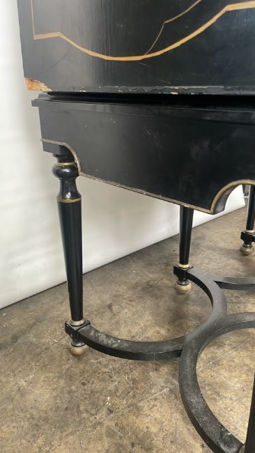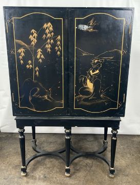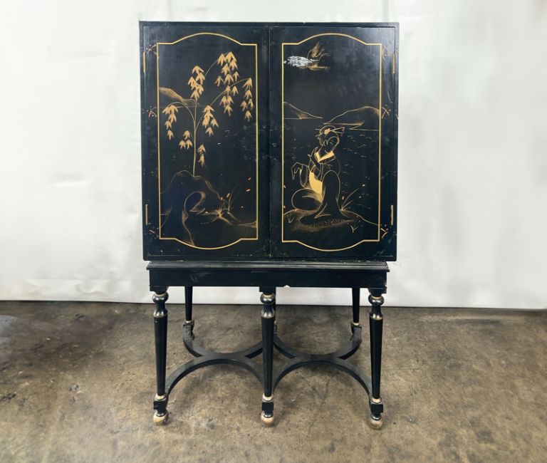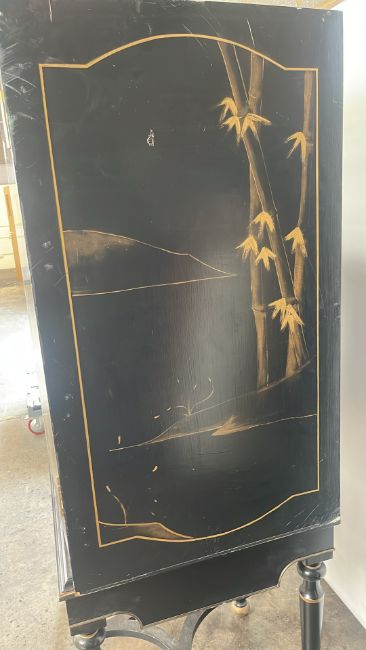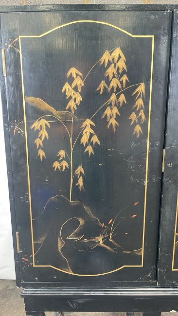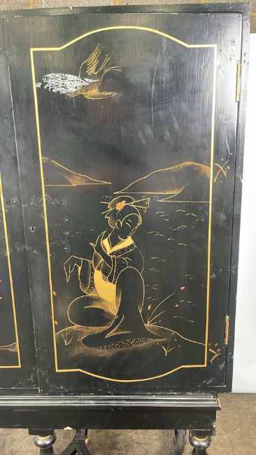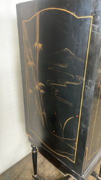 Antique Oriental Design Cabinet Black Wood with painted design, mirrored interior with drawer Signs of use Approximate Dimensions: Height - 163cm Width - 105cm Depth - 55cm Ref - 87 Location - Unit 11