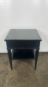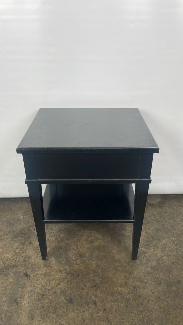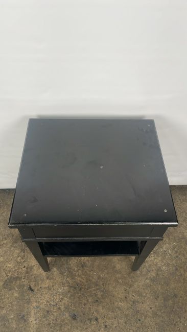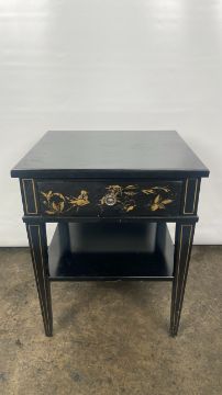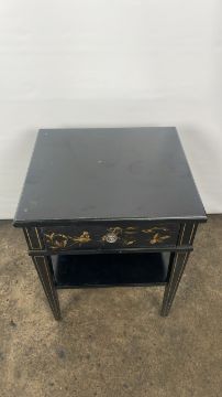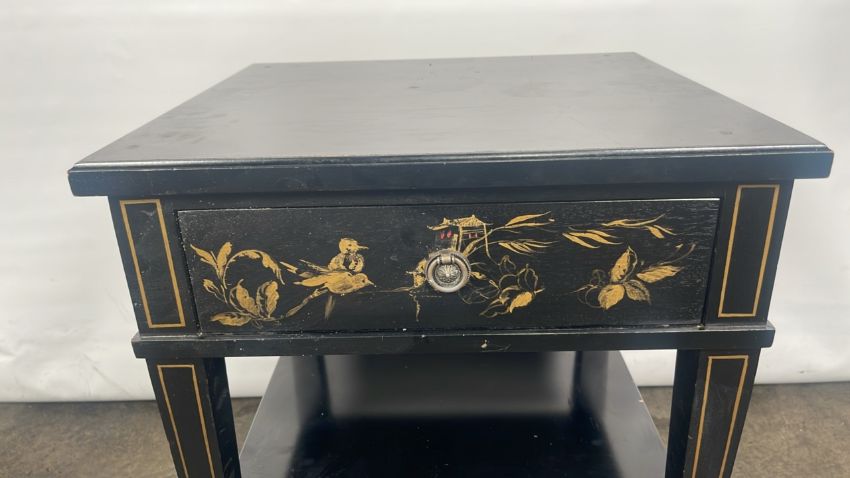 Trouvailles Hand Crafted Oriental Side Table with Drawer Black wood with paint detailing Signs of use Approximate Dimensions: Height - 66cm Width - 55cm Depth - 50cm Ref - 38 Location - Unit 11