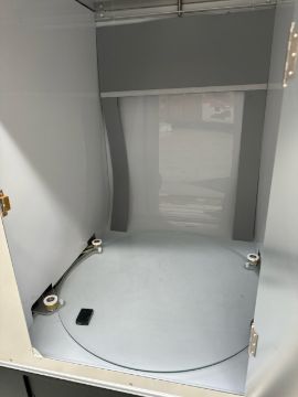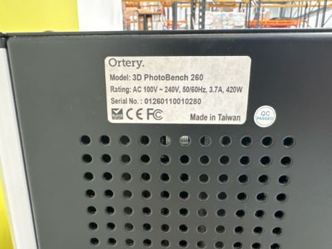 Item has wheels, a front and a side door, a cover for the front but no power lead Rating - AC 100V-240V, 50/60Hz, 3.7A, 420W Serial - 01260110010280 Key Features Software-controlled photography studio (39.4 x 39.4 x 37.8") 26.5" edge-driven, motorized transparent rotational platform with 33 lb weight capacity Take product shots and 360¡ product views on pure white or transparent backgrounds Capture 23 x 23" top shots, 23 x 23 x 23" side shots, 16 x 16 x 22" 360¡ shots Dimmable, daylight LED studio lighting from the bottom, back, and four corners Automated image capture, processing, editing, and saving Computer-controlled camera functionality (via USB connection) and light settings