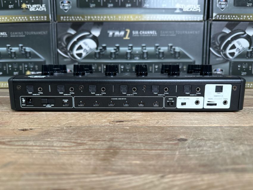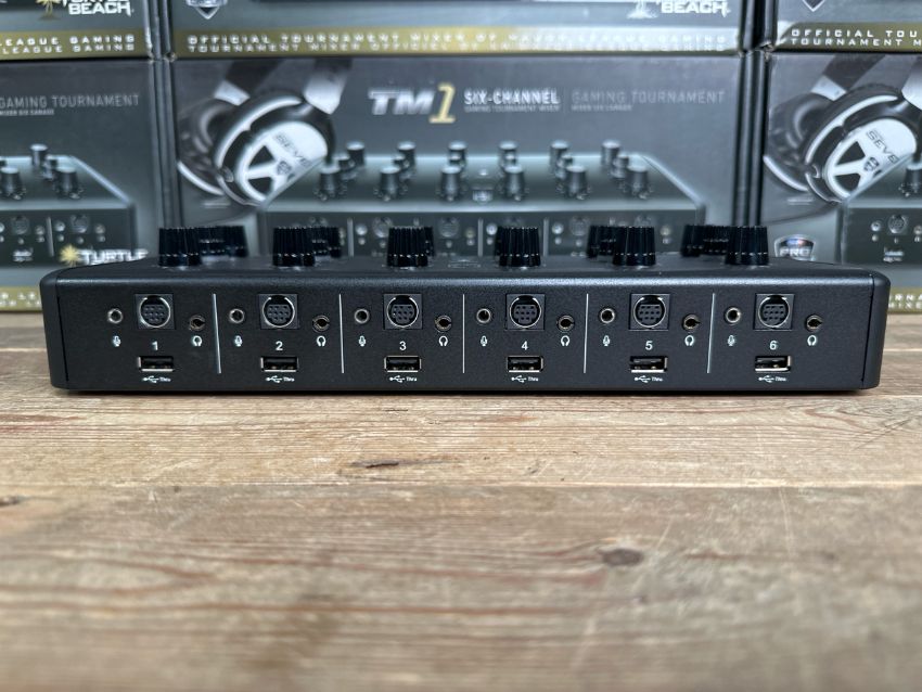 The Ear Force TM1 Tournament Mixer is the new standard for tournament audio. Officially licensed by and developed in cooperation with Major League Gaming, the Tournament Mixer allows up to six players to connect and chat with teammates or a coach during competitive play. The Tournament Mixer provides a closed chat network for a zero latency chat experience. Connect more than six players by connecting two Tournament Mixers together to create a network of 12 players. Each player has control over their game, chat, and/or mic audio volume for the perfect personal balance. The noisy atmosphere of a big tournament is no match for the Ear Force TM1, which uses noise gate technology to eliminate distracting background noises that might be picked up by players’ mics. Turtle Beach and Major League Gaming are dedicated to providing the optimum experience in tournament play. Step up your game and compete to the max with the Ear Force TM1. Versus mode allows you to compete in two teams of three. view larger Connect your favorite headphones so you're part of the action. view larger Headset Features 6 Player Team Communication Allows up to 6 teammates to connect and chat with one another. Designed for a five man team with a coach, or a 6 man team. Versus Mode (3 vs. 3) Divides the mixer into two distinct networks. This allows for the use of just one mixer at small scale events providing two separate closed chat networks of up to 3 users in each channel. Broadcast Output Lets you connect the Tournament Mixer to a broadcast mixer for shout casters and production teams to easily broadcast and mix in the Tournament's chat network with their live stream or audio feed from the event. 3.5 mm, 4 Pole Output Lets you connect your favorite headphones so you're part of the action. Microphone Noise Gate Adjustable noise gate control lets you eliminate distracting background noises your mic may pick up on the tournament floor. Closed Network Chat Provides a zero latency chat experience so there is no delay when communicating with your teammates. External Link Combine two Tournament Mixers to extend the closed chat network for a total of 12 players. External Power Plug the Tournament Mixer into an AC outlet to provide enough power through all of your available USB ports for up to 6 amplified headsets. Independent Volume Controls Indvidual controls for personalized balancing of game, chat, and mic audio.