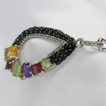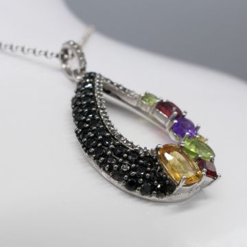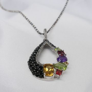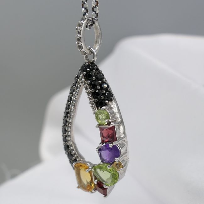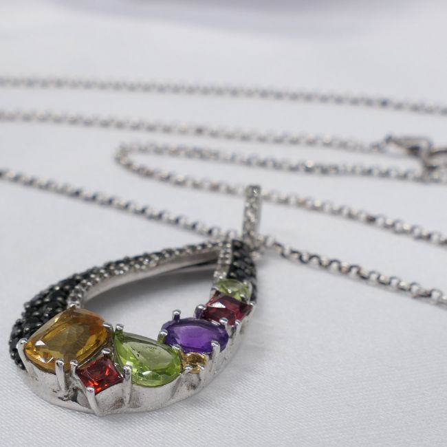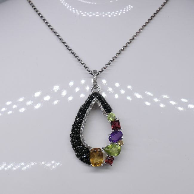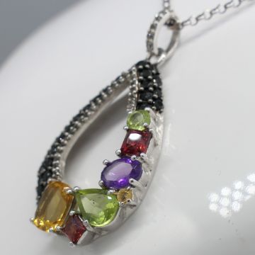 Gemstones: natural; citrine, peridot, amethyst and garnet. Several black and white cubic zirconia stones around edge. Length of pendant: 36 x 21mm. Chain length: 50cm long belcher chain. Bolt ring clasp. Necklace weight: 6.8g. Metal: sterling silver