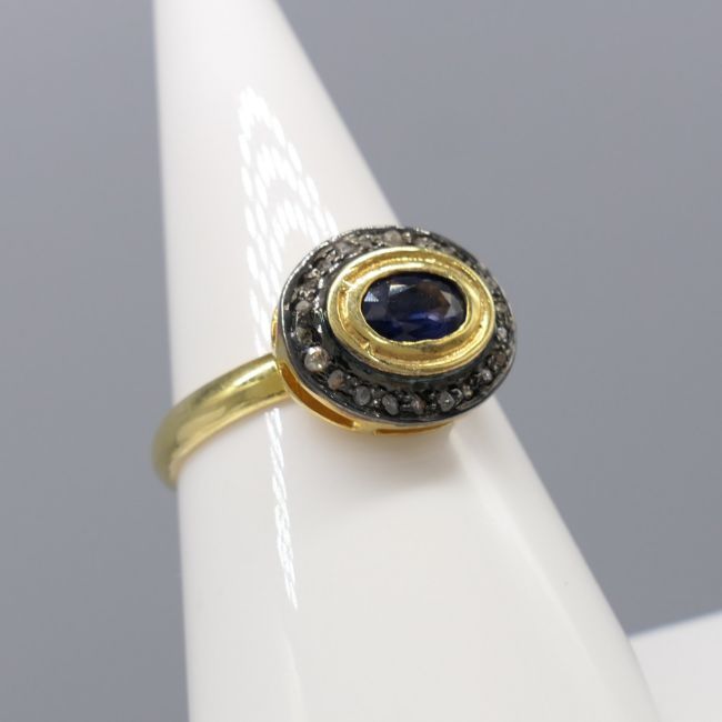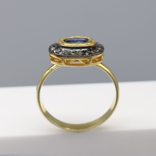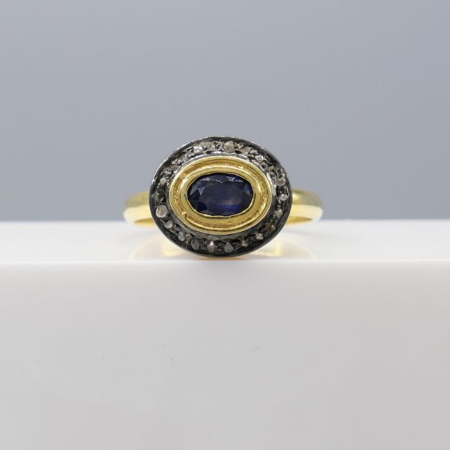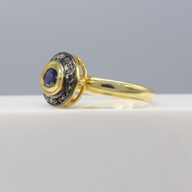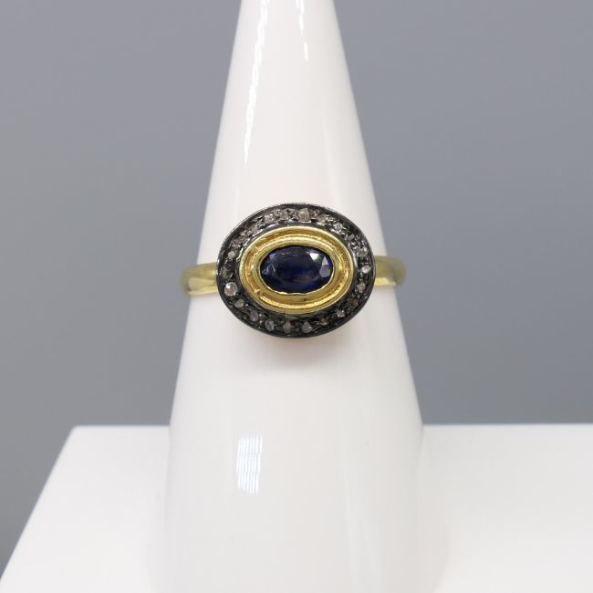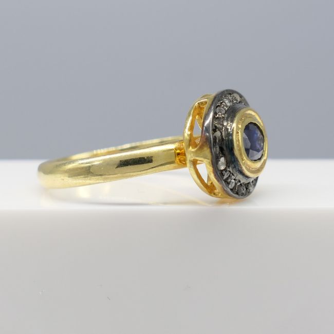 Sapphire: natural; oval-cut; 0.30ct approx. Diamonds: natural; rose-cut 0.15ct total approx; mixed colour and clarity Ring size: Q. Ring weight: 3.4g. Metal: Gold plated silver.