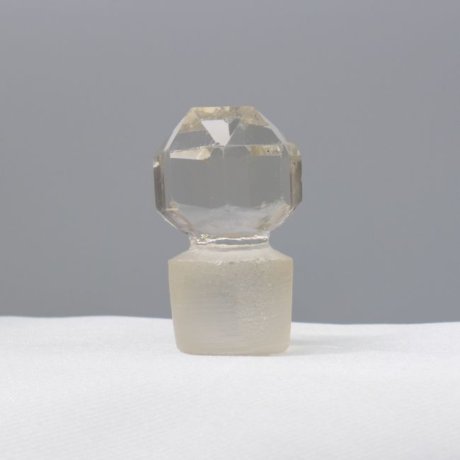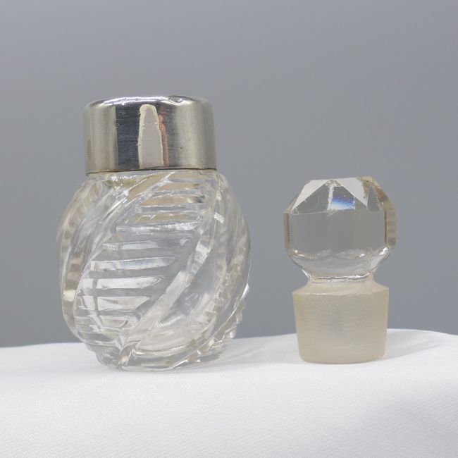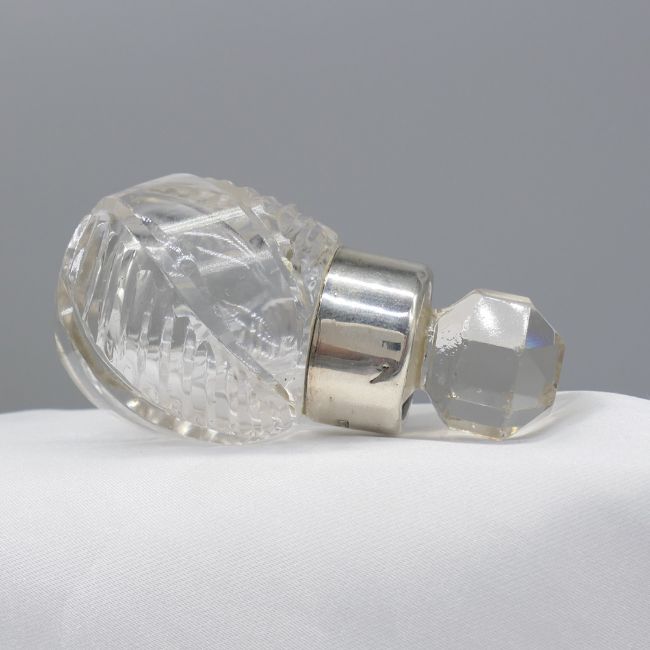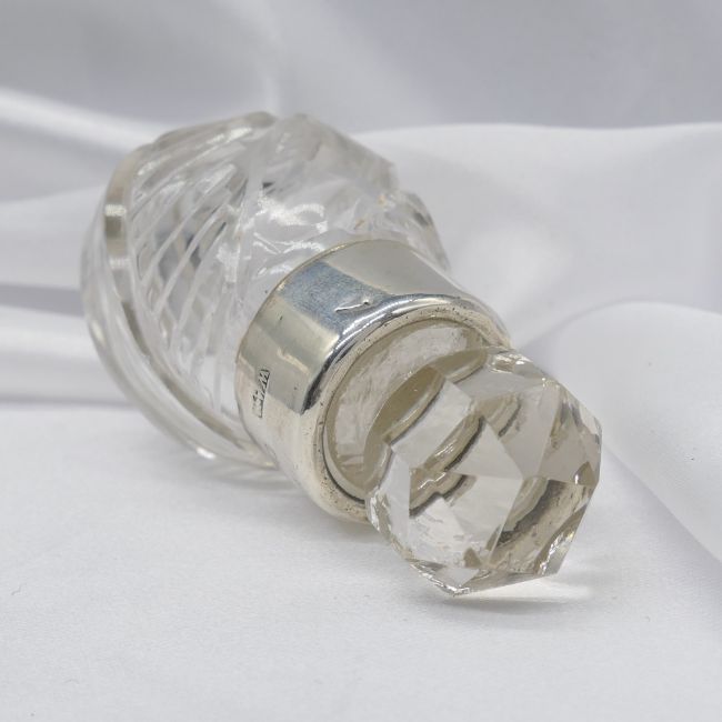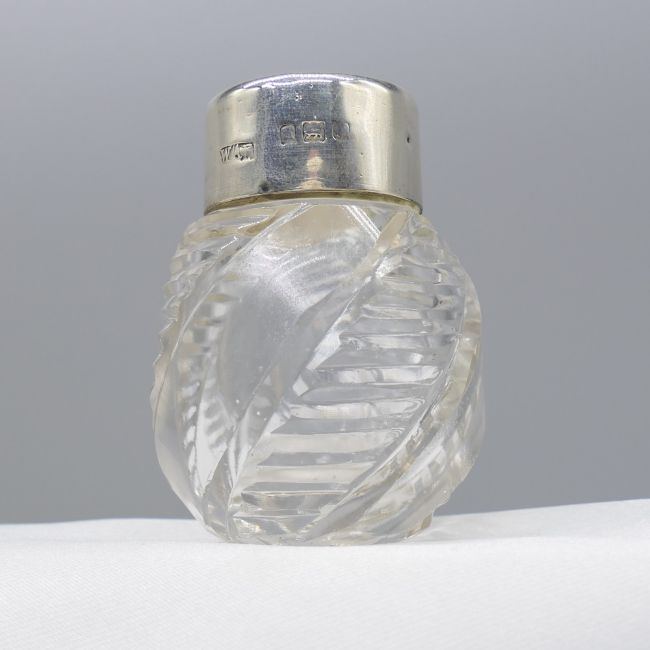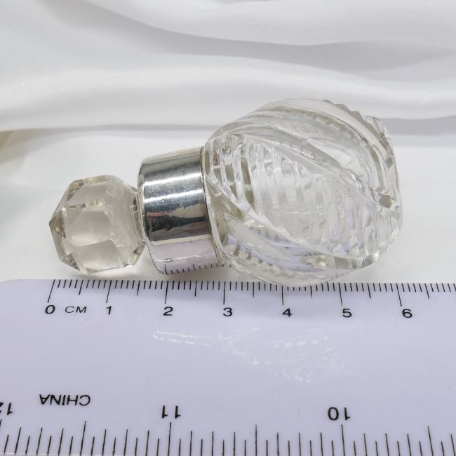Glass: Edwardian cut glass (body and stopper). Collar: sterling silver with vintage London hallmark Bottle measurements (with lid in): 59 x 31mm. Weight: 44.4g. Metal: Silver