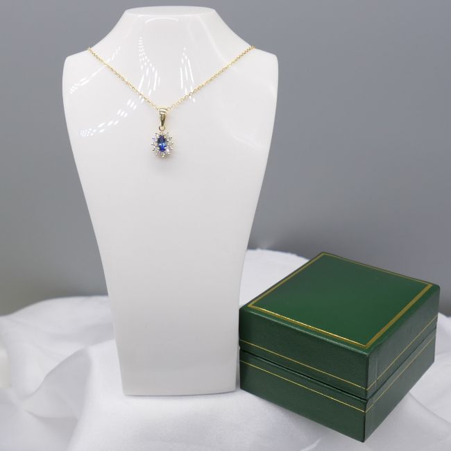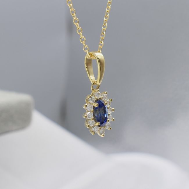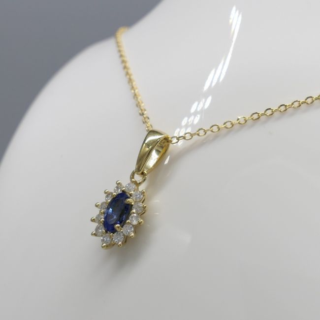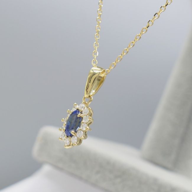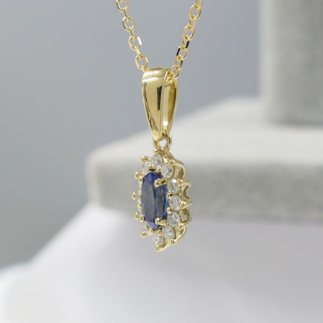 Sapphire: natural; oval-cut; 0.32 ct; claw-set. Diamonds: natural; 12 x round brilliant-cut; 0.12cts total. Pendant measurements: 15 x 6mm. Chain length (extendable): 40 - 45cm; bolt ring clasp Necklace weight: 1.9g. Necklace metal: 18ct yellow gold