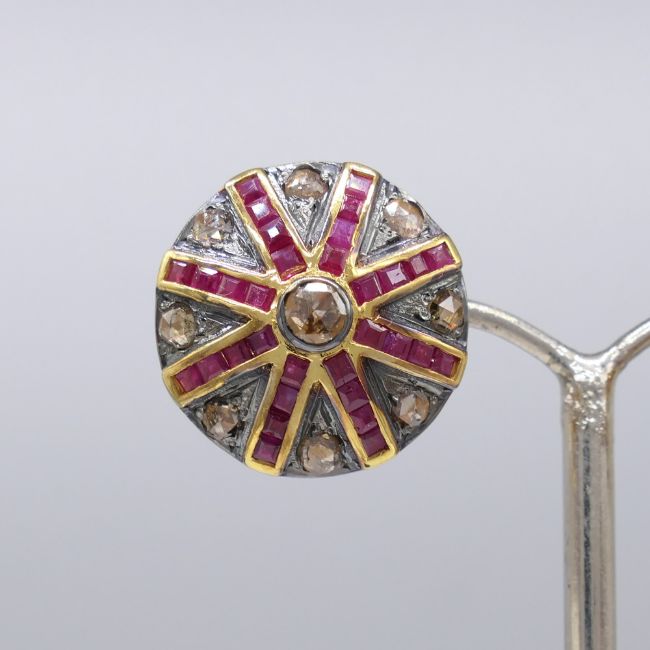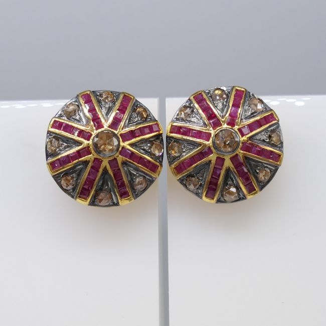 Rubies: natural; 64 x square step-cut; 2.00 cts total; red; channel-set. Diamonds: natural; 18 x rose-cut; 1.27 cts total; yellow toned; rubover and claw-set Features: swirling filigree pattern on the reverse. Supplied with plastic capped trumpet style butterfly backs, and gift box. Earrings diameter: 17mm. Earrings weight: 8.4g. Metal: silver gilt