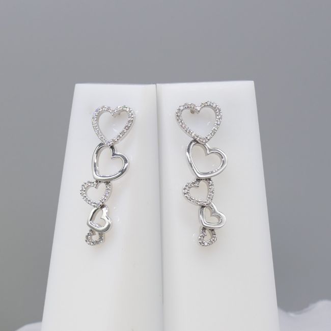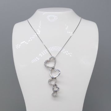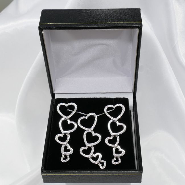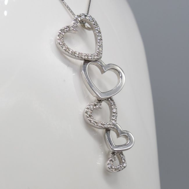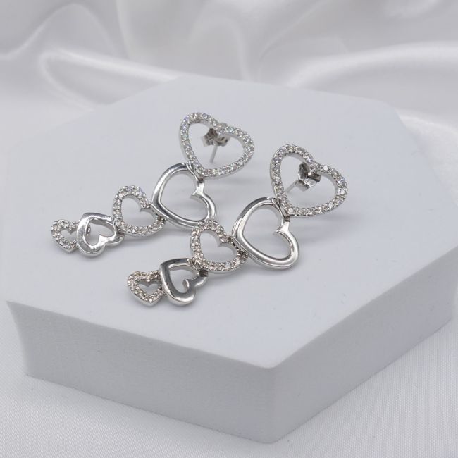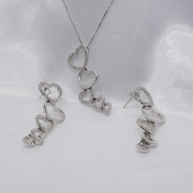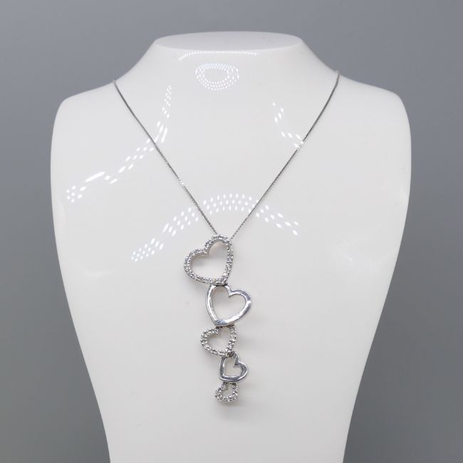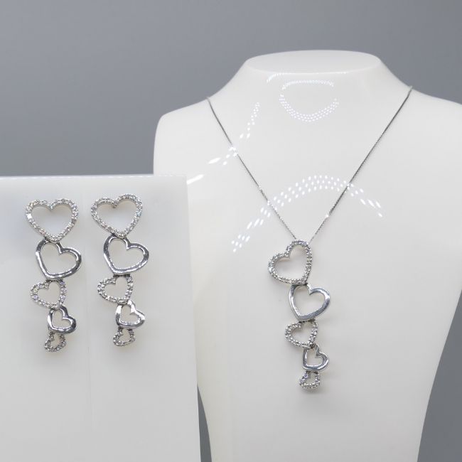 Diamonds: round-cut x 108 total. 0.85ct total; I-J colour approx; good SINecklace: fine box links; 45cm long; bolt ring clasp. Earrings: butterfly backs. Both: tapering heart design with articulation; drop length 39mm.