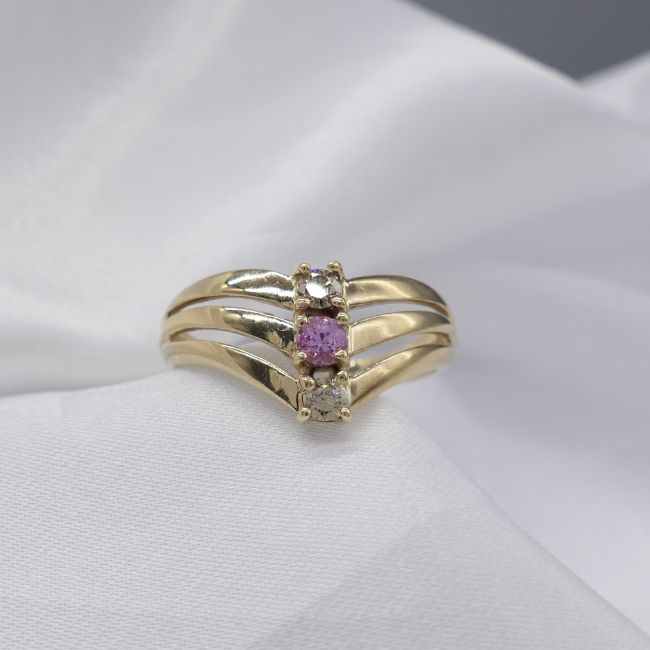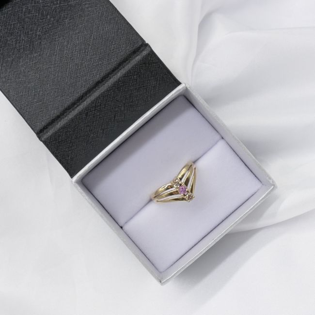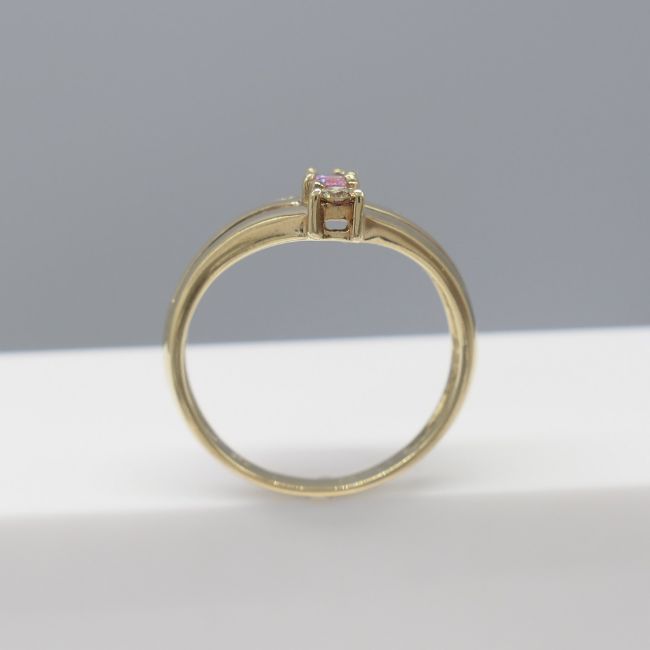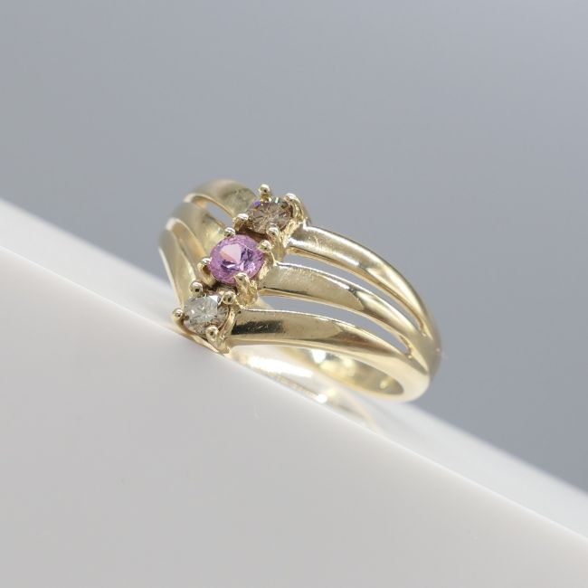 Pink sapphires: natural; round brilliant cut; 0.12ct total; claw set. Diamonds: natural; 2 x round brilliant cut; fancy light brown / champagne colour approx; good SI approx. With gift box Ring size: O. Ring weight: 2.5g. Metal: 9k yellow gold.