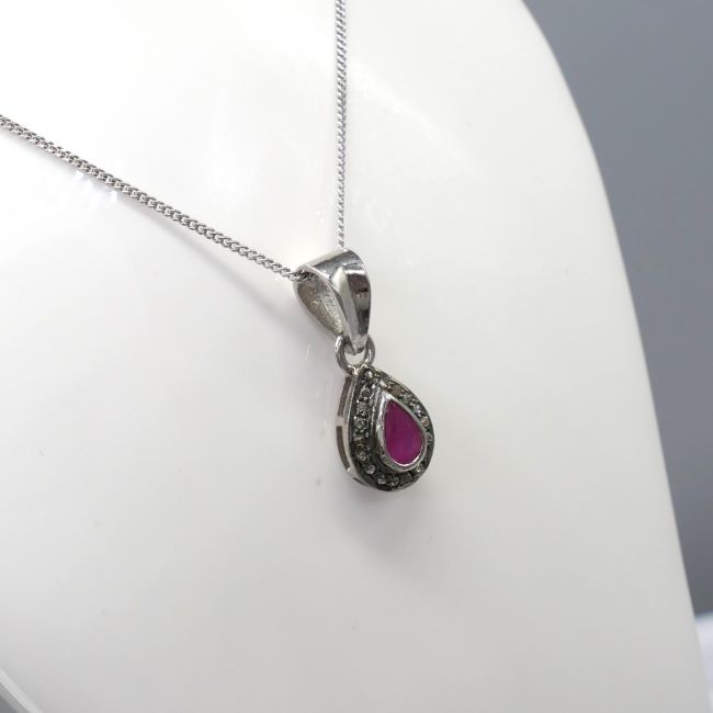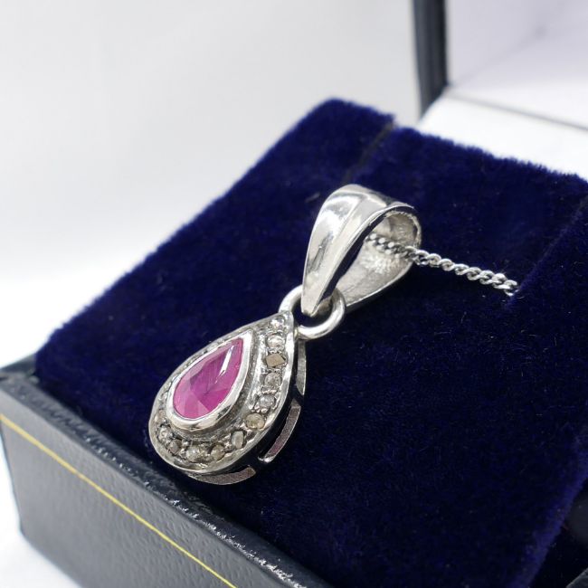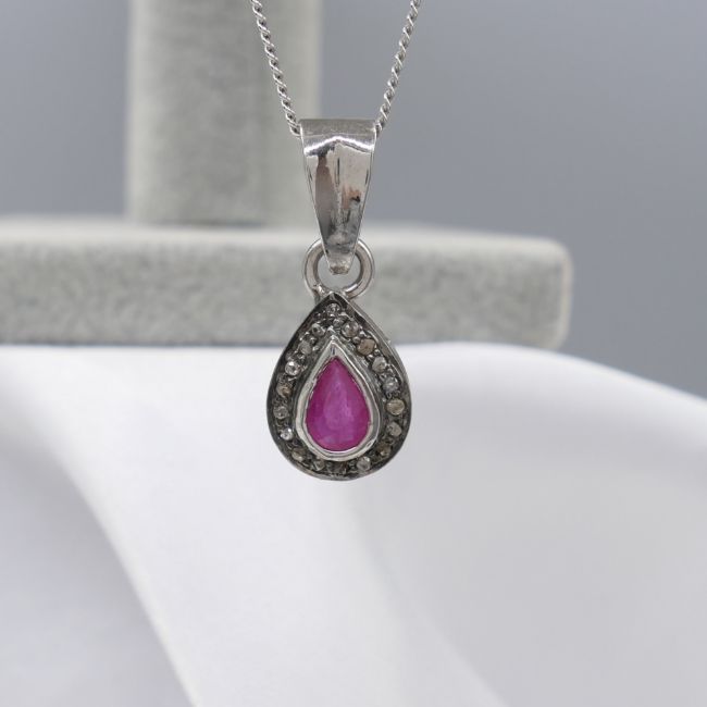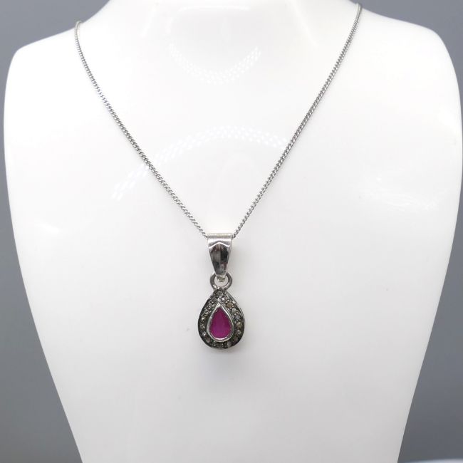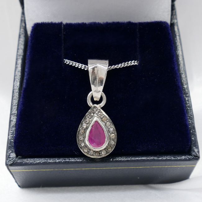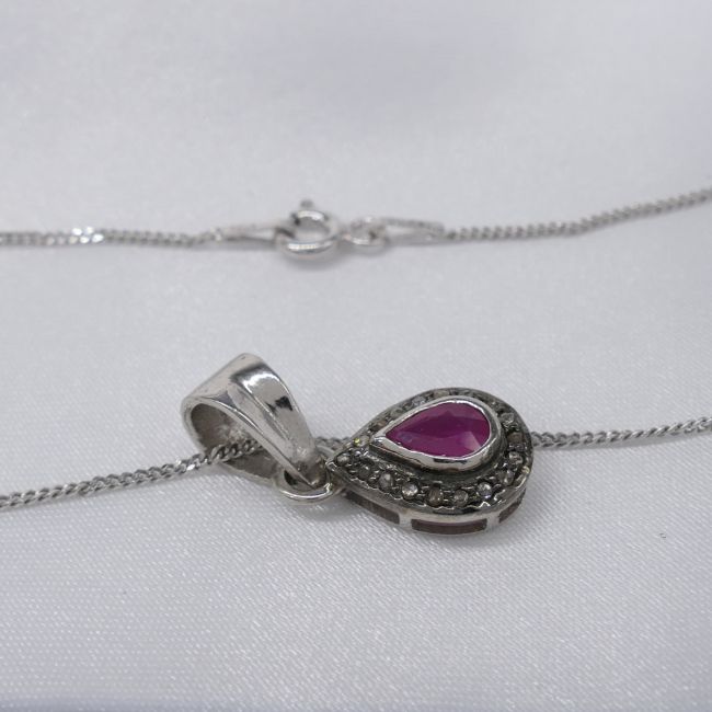 Ruby: natural; pear shaped; 0.28ct approx; red. Diamonds: natural; rose-cut; 0.15ct total approx. Pendant measurements: 10 x 8mm. Chain: 45cm long; bolt ring clasp. With gift box Necklace weight: 3.1g. Necklace metal: sterling silver
