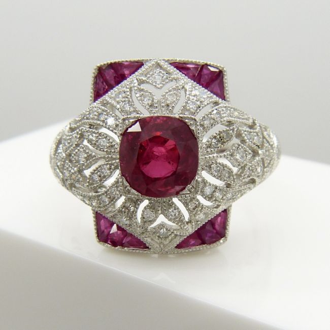 Rubies: natural; 1 x round mixed cut, 12 calibre-cut; 1.00 cts total approx; grain-set. Diamonds: natural; several x eight-cut; 0.58 cts total approx; H-I / good SI approx; pierced ornate setting