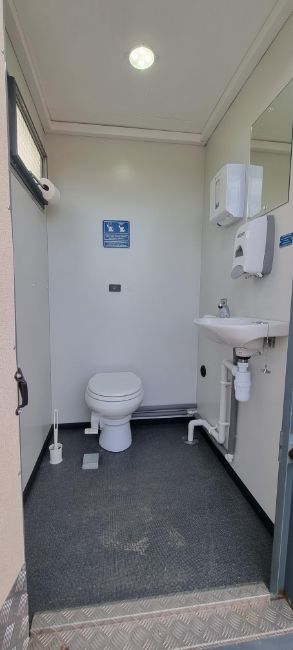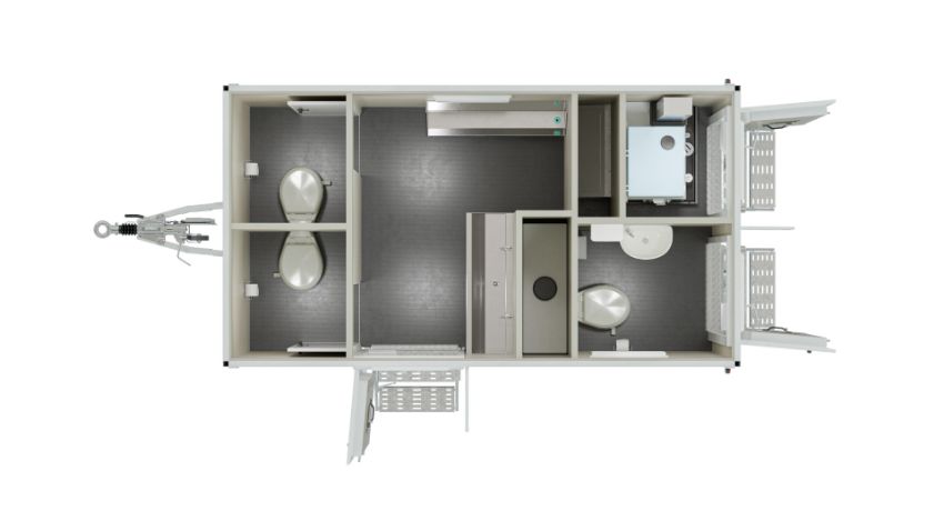 • Road towable 2+1 toilet unit with a fixed chassis enabling the unit to be set up at a site within 5 minutes of arrival