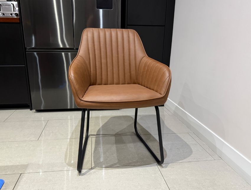 Upholstered in resilient faux leather, the Brooks armchairs provide a functional seating option for both dining and living spaces. Designed with a high backrest and incorporated armrests for support and with minimalist metal legs providing a stable base. Easy to assemble and supplied as a pair, these armchairs are foam-filled for comfort.