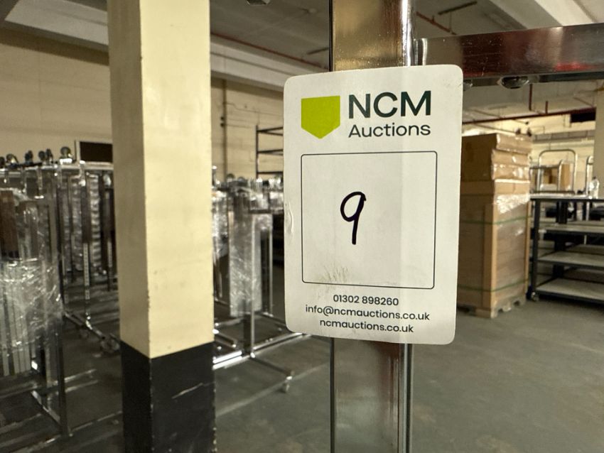 6 x Chrome Mobile Merchandising Rails4 x Arms to each rail4 x WheelsAdjustable HeightApproximate Dimensions:Height - 160cmWidth - 90cmDepth - 90cmRef - 9Location - 3rd floor