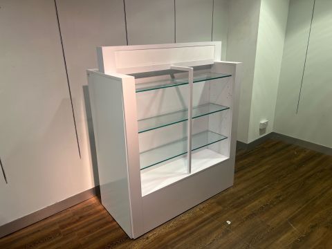 White Glossy Display Unit With Glass Shelves & Drawers - NO RESERVE