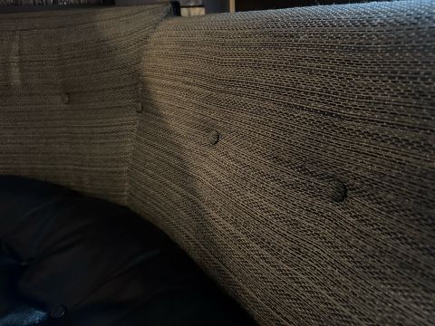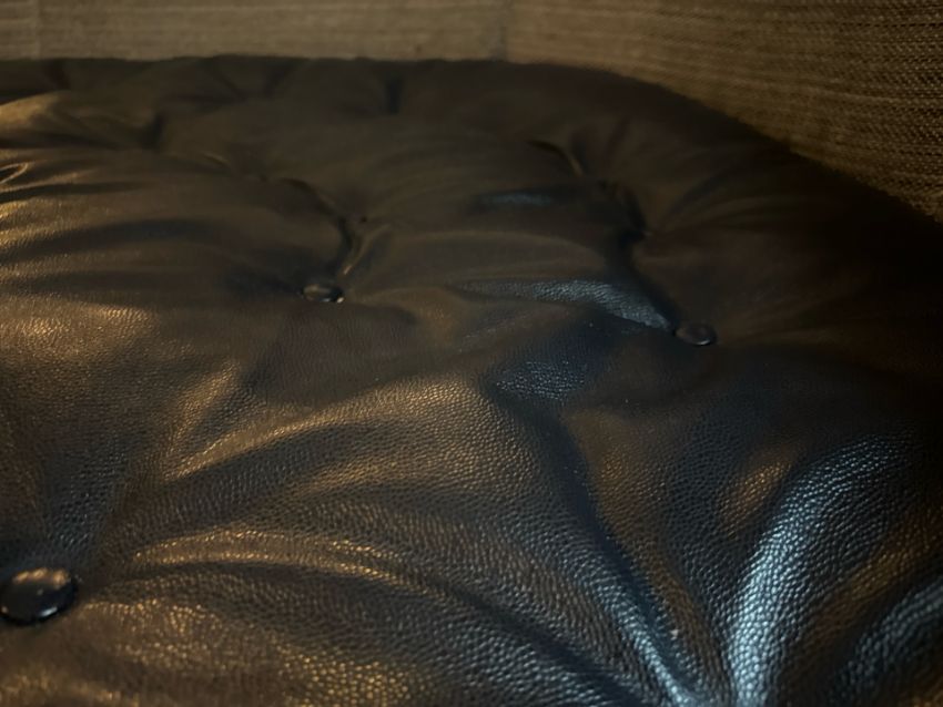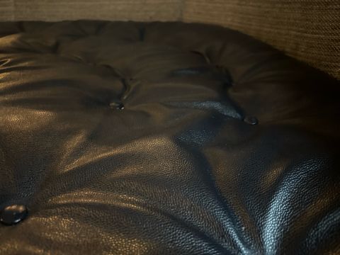 Navy Leather Seat with blue fabric back and sides and wooden legs
