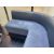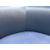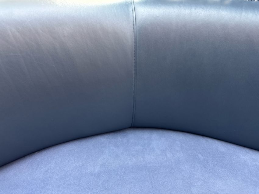 Navy leather back with blue fabric seat and wooden base