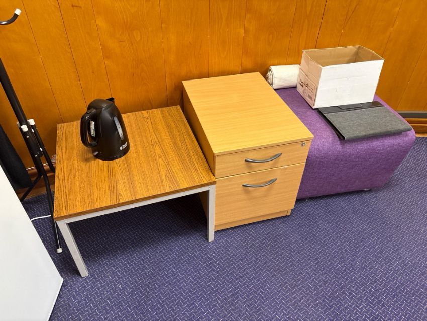 To Include: 1 x Fridge 2 x Couch 3 x Pedestals 2 x Coffee Tables 1 x Purple Puff 2 x Office Chairs