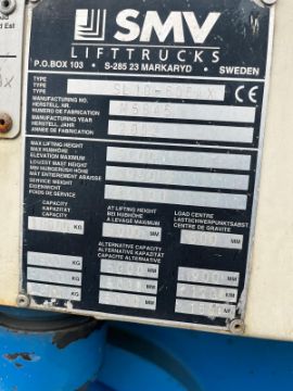 SMV 10 Tonne Lift Capacity LOLER valid to May 2026 10 tonnes at 600mm load centre max lifting height 5000mm lowest mast height 3950mm service weight 14100kg good running order, just come off contract customer has replaced one of the tyres with an incorrectly sized tyre Location: Corby, NN17 Viewing - Strictly by appointment ONLY Collection - Please bring a hard copy of your collection note & ID to site. The collection note is proof of your payment. Please note it is the buyers responsibility to arrange for decommission (if needed), dismantling & removal of items from site. Once on site you will be required to sign in & then be guided to your lots. You will then be asked to remove the goods & loads your own goods as we cannot help to remove or load goods in anyway. Collection dates - Within 7 days of the auction ending. Payment - Strictly within 2 working days of the auction ending. We strongly advise to pay your invoice by BACS/Faster payment as we cannot release goods without a cleared payment. Paying by card on the payment link can take up to 3 days to clear. Contact - For any enquiries please do not hesitate to contact our team in the NCM office - 01302 898260 or email info@ncmauctions.co.uk