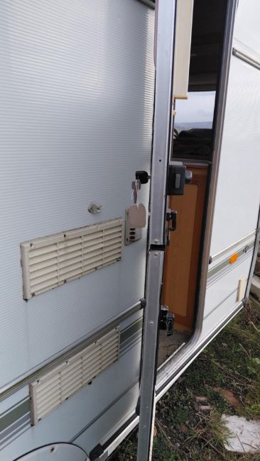 has keys for door and side locker and manuals floor little soft infront shower but okay at present clean inside for age no damage on outside any inspection welcome