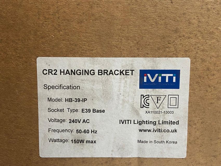 IVITI CR2 Hanging Bracket, model HB-39-IP E39 base, 240V, 150W max Single Item per box, 10 boxes Unused, in Boxes. Location: Bradford, BD3 8JR ref: 190925 Collection - Please bring a hard copy of your collection note & ID to site. The collection note is proof of your payment. Please note it is the buyers responsibility to arrange for decommission (if needed), dismantling & removal of items from site. Once on site you will be required to sign in & then be guided to your lots. You will then be asked to remove the goods & loads your own goods as we cannot help to remove or load goods in anyway. Collection dates - Within 7 days of the auction ending. Payment - Strictly within 2 working days of the auction ending. We strongly advise to pay your invoice by BACS/Faster payment as we cannot release goods without a cleared payment. Paying by card on the payment link can take up to 3 days to clear.