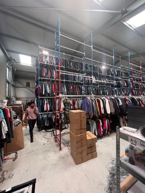 - Approximately 35 bays of industrial pallet racking which have been customised for garment storage. The beam width has been reduced to approximately 60cm and steel bars have been added across the beams to allow garments to hang directly from the racking.