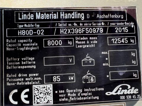 2015 Linde H80D 7836 hours  H2X195F01264 M195-080S01-0525-06/396 8 tonne diesel forklift 5.2m lift Deutz engine good runner unladen mass 12545kg rated drive power 85kW 2015 model Location: Southampton, SO19 ref: 210725 Viewing - Strictly by appointment ONLY Delivery: can be arranged at additional cost, please contact for quote Collection - Please bring a hard copy of your collection note & ID to site. The collection note is proof of your payment. Please note it is the buyers responsibility to arrange for decommission (if needed), dismantling & removal of items from site. Once on site you will be required to sign in & then be guided to your lots. You will then be asked to remove the goods & loads your own goods as we cannot help to remove or load goods in anyway. Collection dates - Within 7 days of the auction ending. Payment - Strictly within 2 working days of the auction ending. We strongly advise to pay your invoice by BACS/Faster payment as we cannot release goods without a cleared payment. Paying by card on the payment link can take up to 3 days to clear. Contact - For any enquiries please do not hesitate to contact our team in the NCM office - 01302 898260 or email info@ncmauctions.co.uk