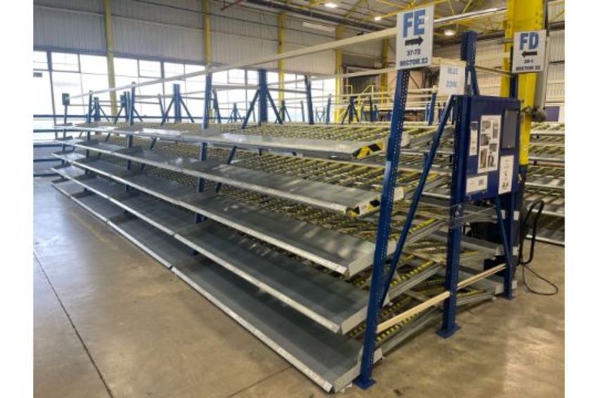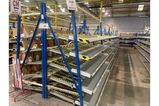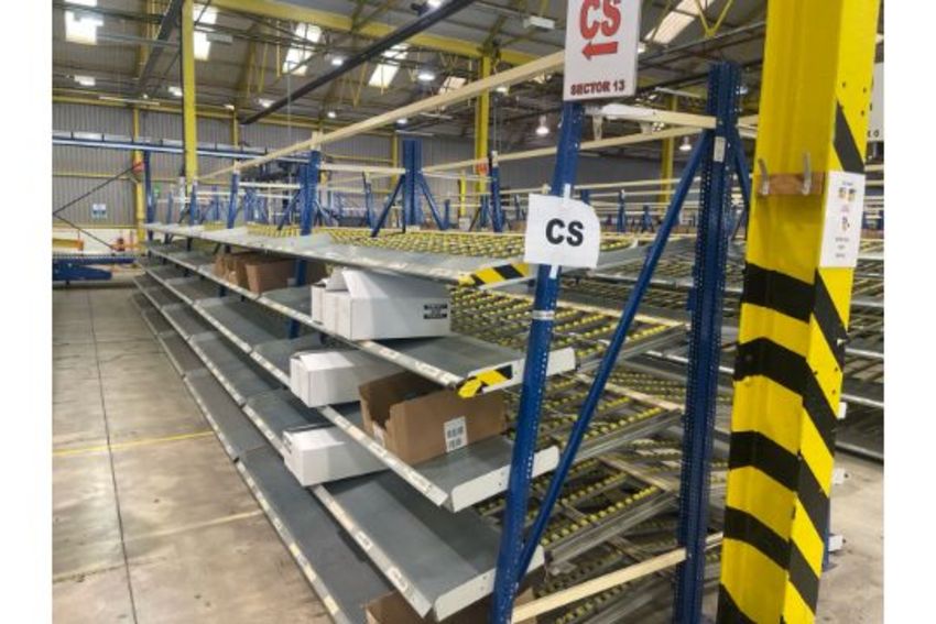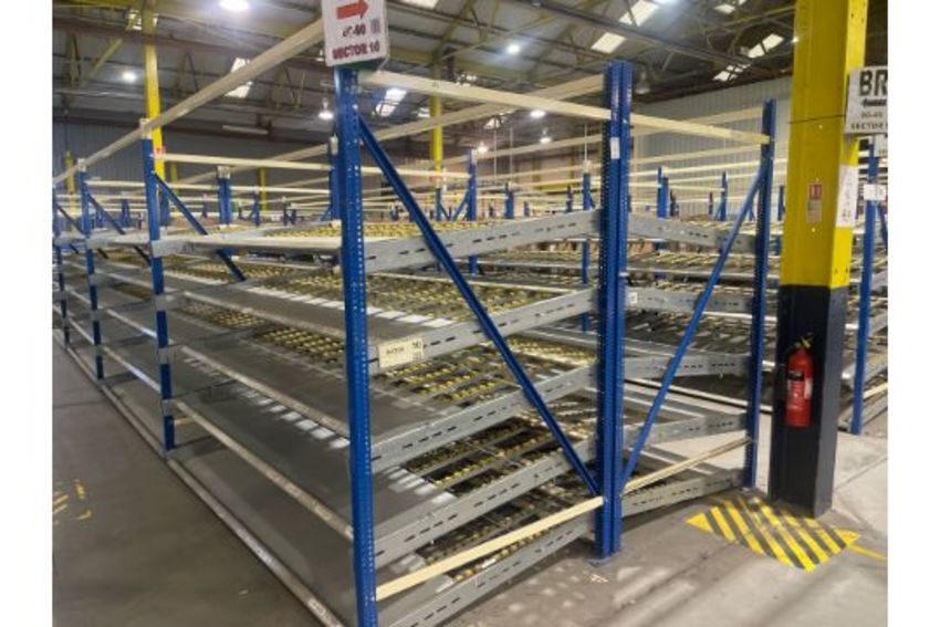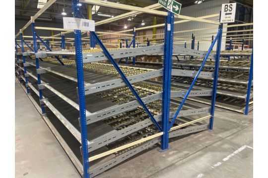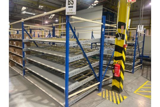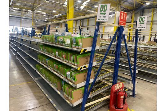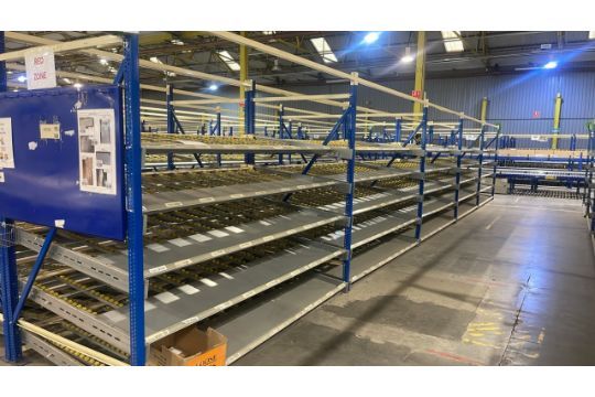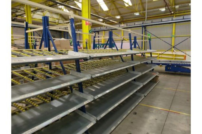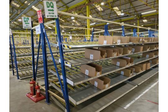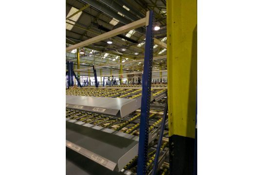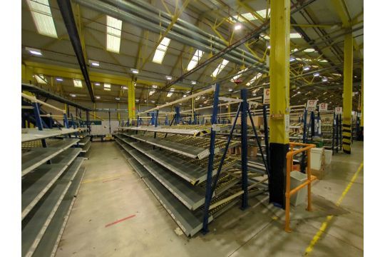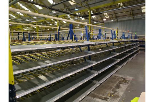 A total of 181 bays of back to back flow racking consists 224 frames 910 flow shelves this racking was sold by ourselves last year to the current owner who dismantled & palletised the racking with the intention of using in their own facility the racking was never installed by the buyer and therefore remains palletised and is now surplus to requirements the images in the lots show the racking as it was installed in its previous environment (Hallmark Cards Distribution Centre, Bradford) and also show the racking now palletised and ready for collection the approximate dimensions of the racking are as follows: frame height: 220cm frame width: 100cm shelf depth: 120cm shelf length: 255cm Location: Stroud, GL5